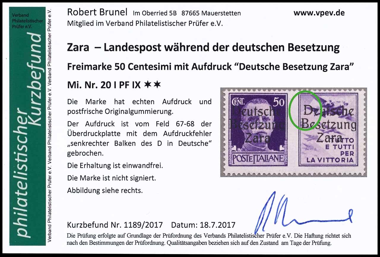 50 Centesimi mit Aufdruck "Deutsche Besetzung Zara", mit Propagandafeld4=Stahlhelm, Marke mit Aufdruckfehler IX "senkrechter Balken des D von Deutsche gebrochen" Bogenfeld 67-68, postfrisch, tadellose Erhaltung, Fotobefund Robert Brunel VP (2020) "die Erhaltung ist einwandfrei", Mi. 150.-
