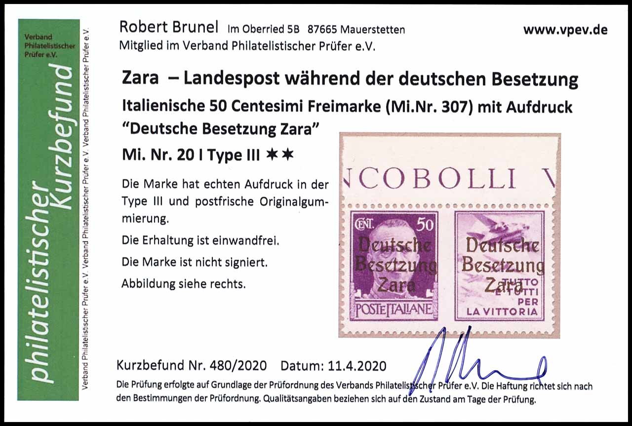 50 Centesimi mit Aufdruck "Deutsche Besetzung Zara", mit Propagandafeld3=Luftwaffe, Marke mit Aufdrucktype III, vom Oberrand, postfrisch, tadellose Erhaltung, Fotobefund Robert Brunel VP (2020), "die Erhaltung ist einwandfrei", Mi. 400.-