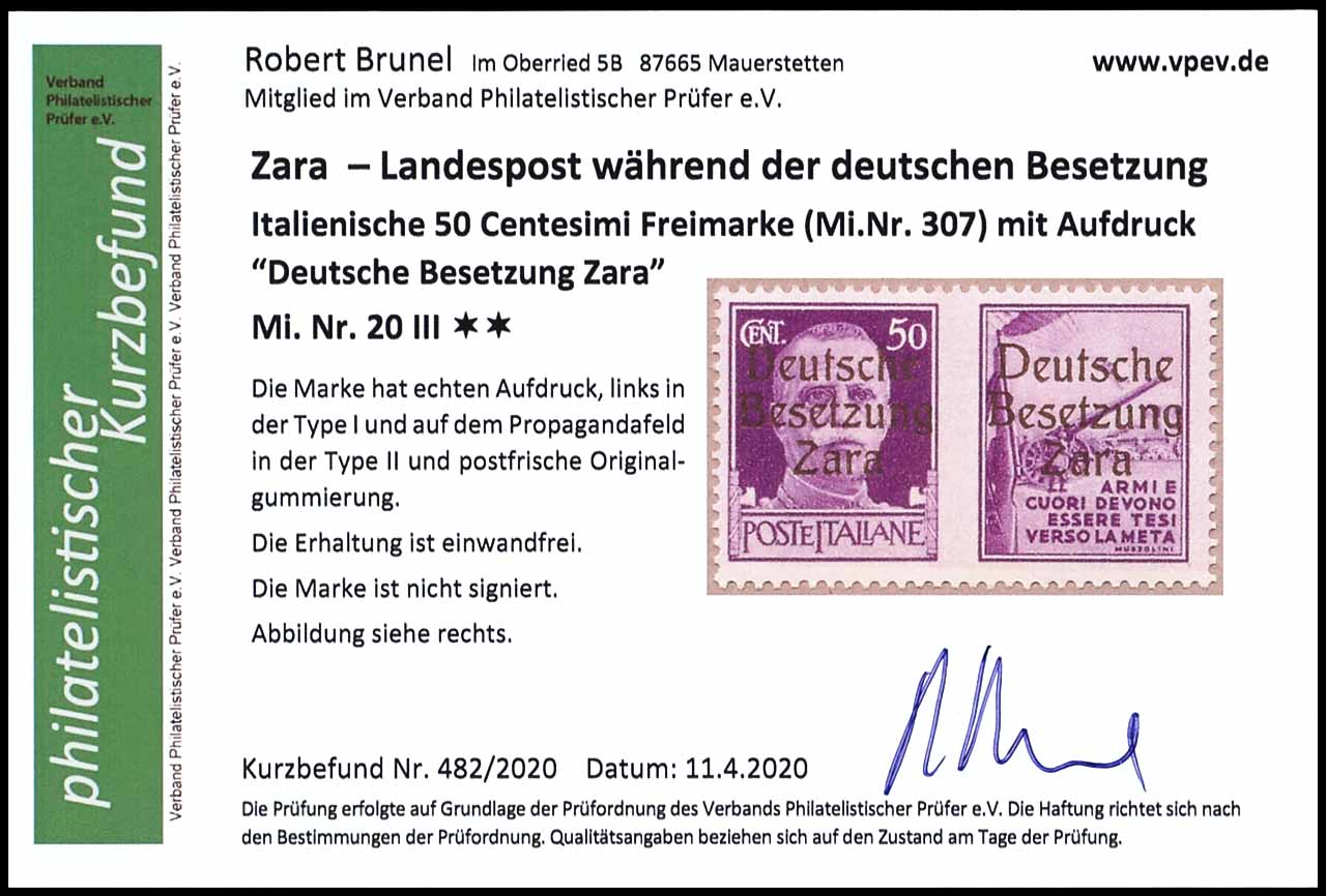 50 Centesimi mit Aufdruck "Deutsche Besetzung Zara", mit Propagandafeld 2 = Artillerie, Marke mit Aufdrucktype I und Propagandafeld in Aufdrucktype II, postfrisch, tadellose Erhaltung, Fotobefund Robert Brunel VP (2020) "Die Erhaltung ist einwandfrei", Mi. 375.-