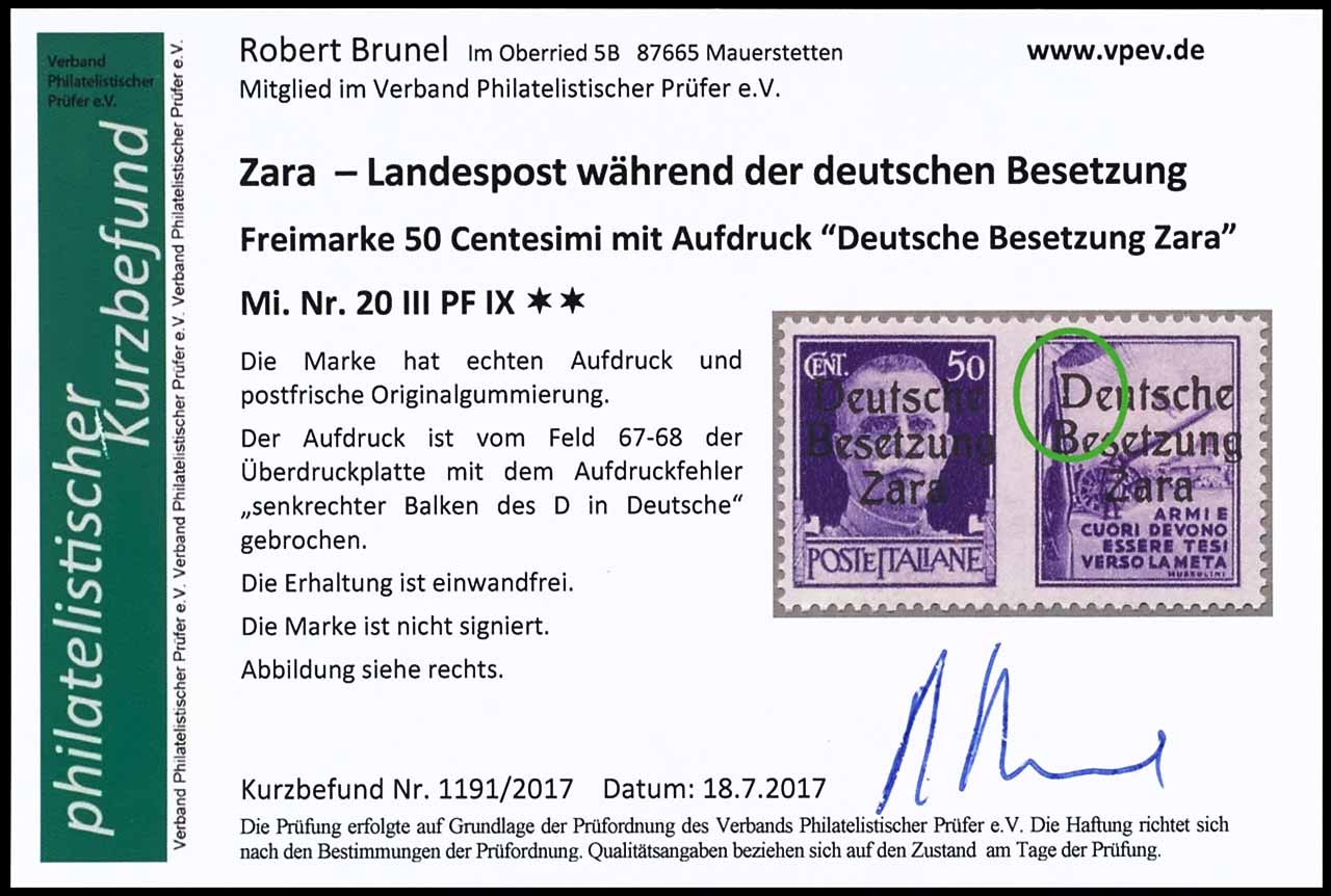 50 Centesimi mit Aufdruck "Deutsche Besetzung Zara", mit Propagandafeld2=Artillerie, Marke mit Plattenfehler IX: "senkrechter Balken des D von Deutsche gebrochen", postfrisch, tadellose Erhaltung, Fotobefund Robert Brunel VP (2020) "die Erhaltung ist einwandfrei", Mi. 150.-
