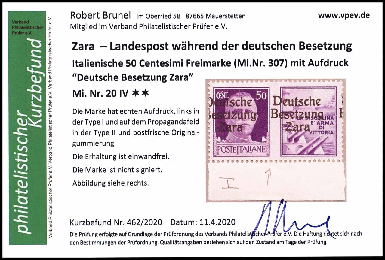 50 Centesimi mit Aufdruck "Deutsche Besetzung Zara", mit Propagandafeld1=Marine, Marke mit Aufdrucktype I und Propagandafeld mit Aufdrucktype II, postfrische Erhaltung, Fotobefund Robert Brunel VP (2020) "die Erhaltung ist einwandfrei", Mi. 375.-