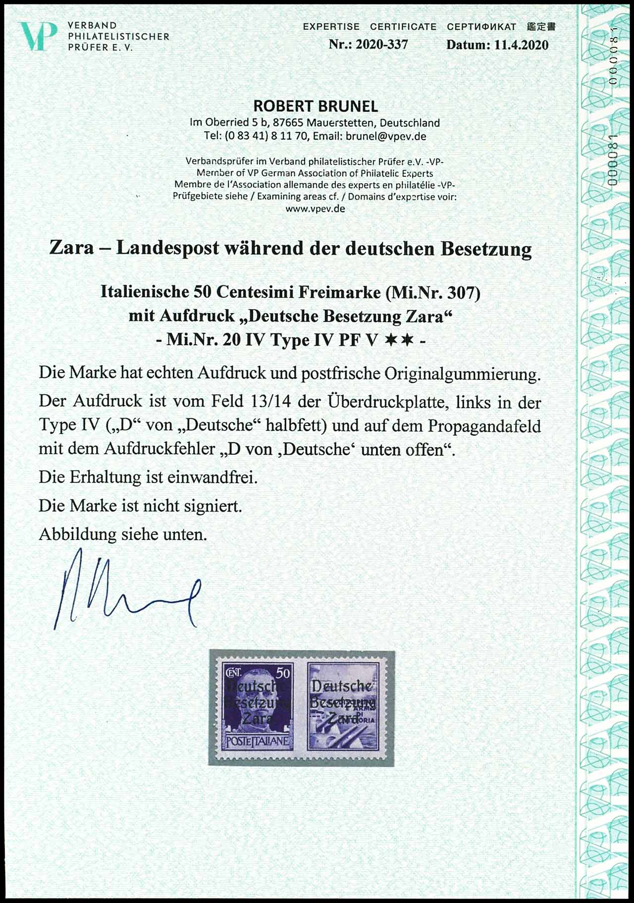 50 Centesimi mit Aufdruck "Deutsche Besetzung Zara", mit Propagandafeld1=Marine, MiNr. 20IV "D von Deutsche halbfett, Feld 13" Marke mit Aufdruckfehler V auf dem Propagandafeld "D von Deutsche unten offen, Feld 14", postfrisch, tadellose Erhaltung, unsigniert, Fotobefund Robert Brunel VP (2020) "Die Erhaltung ist einwandfrei", Mi. 850.-