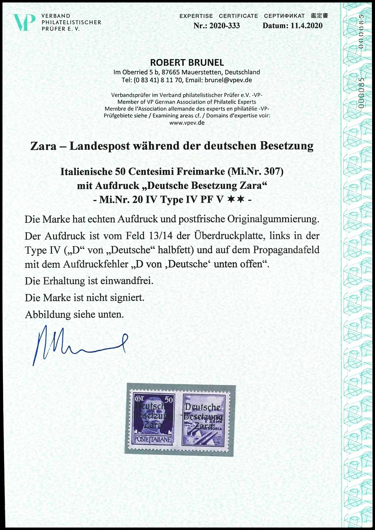 50 Centesimi mit Aufdruck "Deutsche Besetzung Zara", mit Propagandafeld1=Marine, MiNr. 20IV "D von Deutsche halbfett, Feld 13" Marke mit Aufdruckfehler V auf dem Propagandafeld "D von Deutsche unten offen, Feld 14", postfrisch, tadellose Erhaltung, unsigniert, Fotobefund Robert Brunel VP (2020) "Die Erhaltung ist einwandfrei", Mi. 850.-