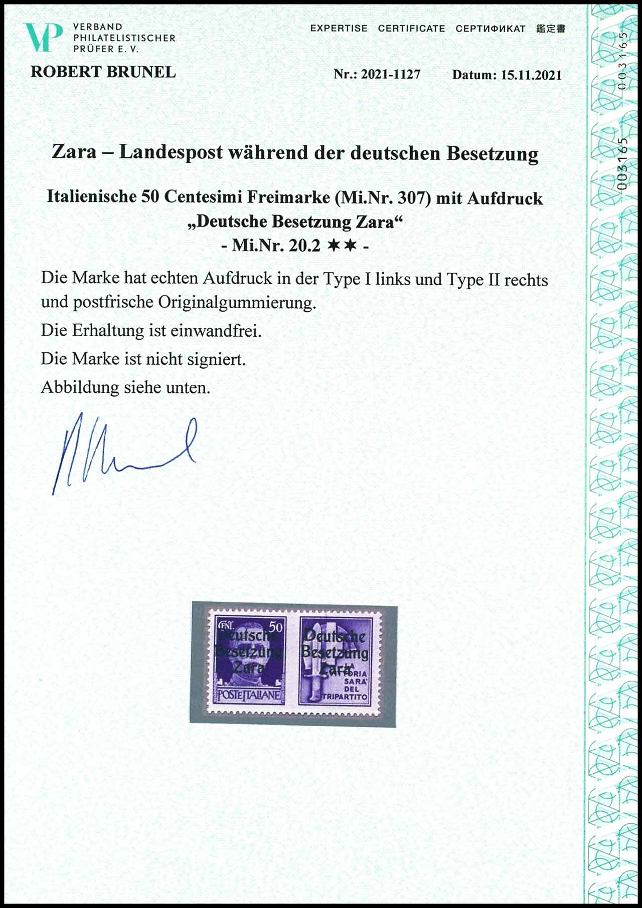 50 Centesimi mit Aufdruck "Deutsche Besetzung Zara", mit Propagandafeld2=Stahlhelm, MiNr. 20.2, mit Type I links und Type II rechts, postfrisch, tadellose Erhaltung, Fotobefund Robert Brunel VP (2020) "die Erhaltung ist einwandfrei"
