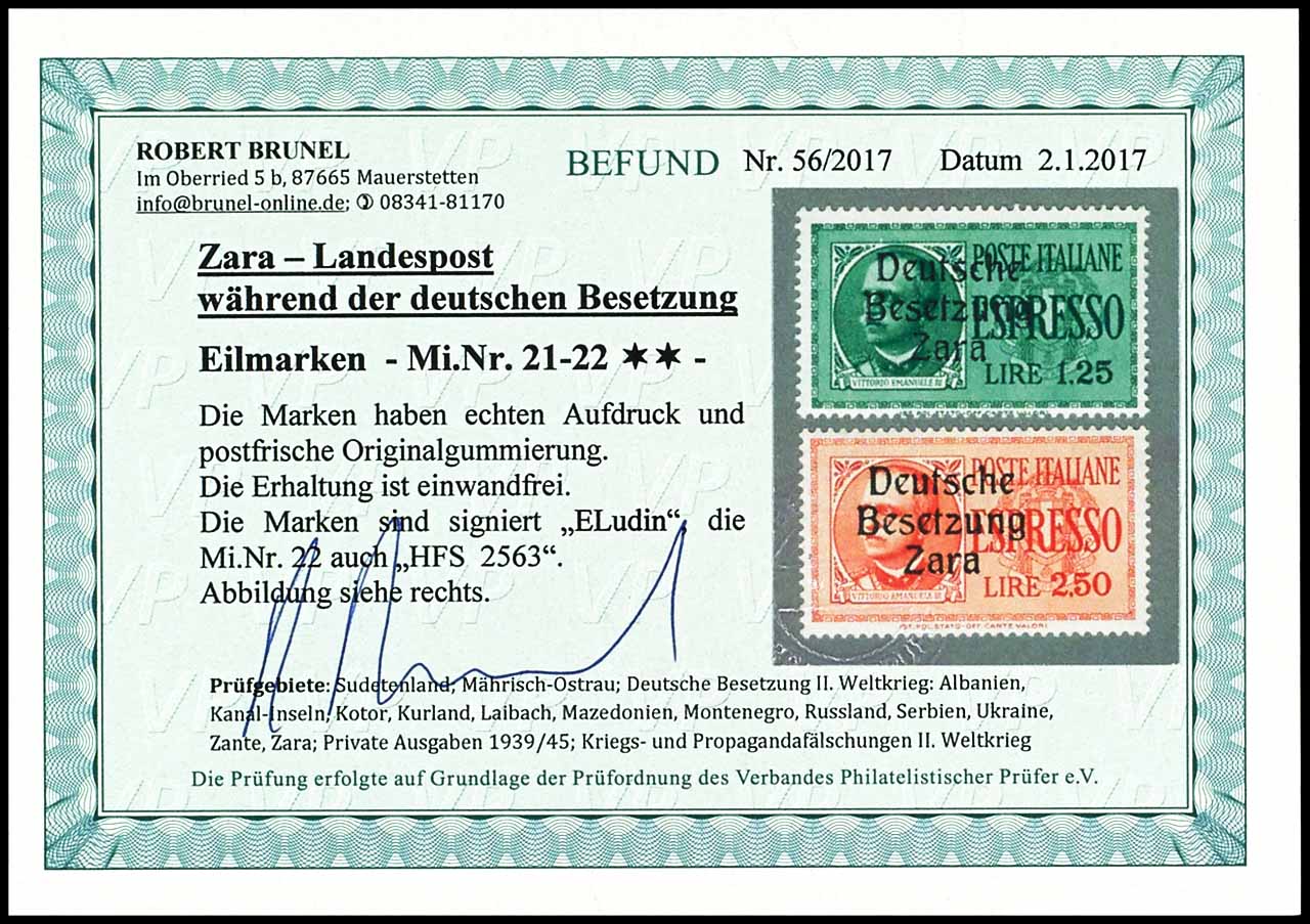 1.25 Lire und 2,50 Lire Eilmarken mit Aufdruck "Deutsche Besetzung Zara",kompletter Satz, in einwandfreier postfrischer Erhaltung, signiert, Fotobefund Uwe Kleymann "Die Erhaltung ist einwandfrei.", Mi. 300.-