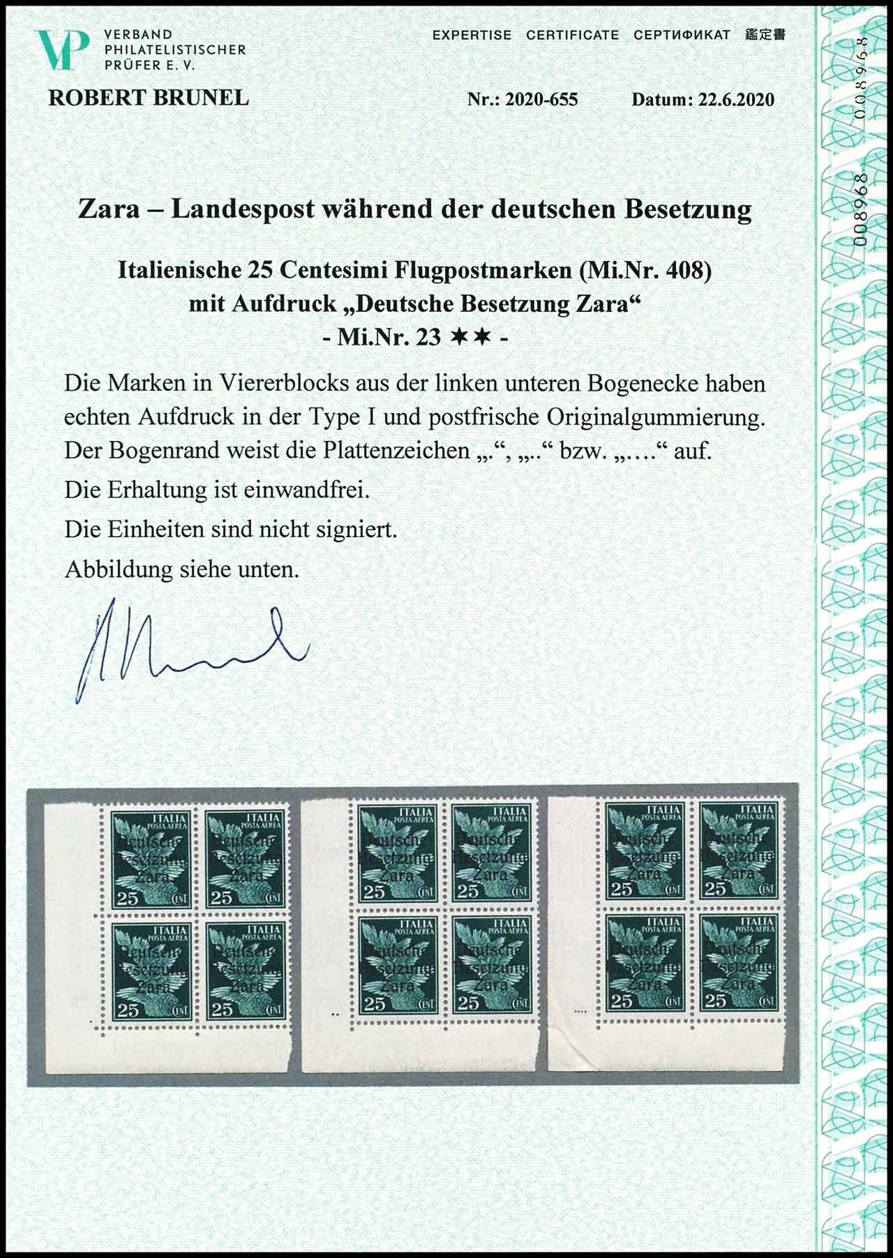 25 Centesimi mit Aufdruck "Deutsche Besetzung Zara", mit Aufdrucktype I, drei Viererblöcke aus der linken unteren Bogenecke mit drei unterschiedlichen Plattenzeichen "ein Punkt", "zwei Punkte" und "drei Punkte", postfrisch, tadellose Erhaltung, Expertise Robert Brunel VP (2020) "die Erhaltung ist einwandfrei", Mi. 420.-