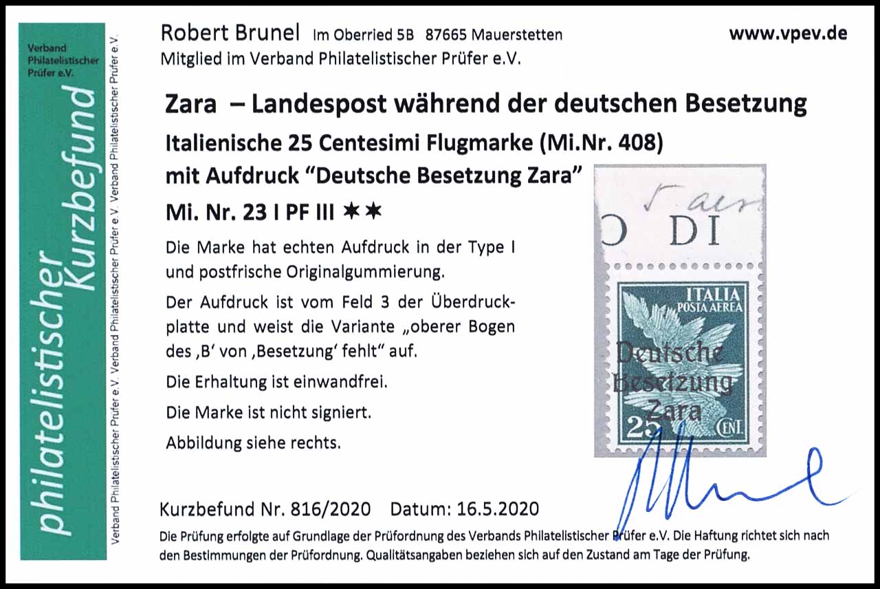 25 Centesimi mit Aufdruck "Deutsche Besetzung Zara", mit Aufdrucktype I, mit Plattenfehler III "oberer Bogen des "B" von Besetzung fehlt, Feld3", postfrisch, tadellose Erhaltung, Fotobefund Robert Brunel VP (2020) "die Erhaltung ist einwandfrei", Mi. 175.-