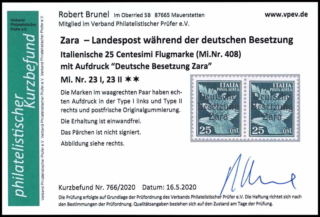 1 Lire mit Aufdruck "Deutsche Besetzung Zara", waagrechtes Paar, mit Aufdrucktype I links und Aufdrucktype II rechts, postfrisch, tadellose Erhaltung, Fotobefund Robert Brunel VP (2020) "Die Erhaltung ist einwandfrei"