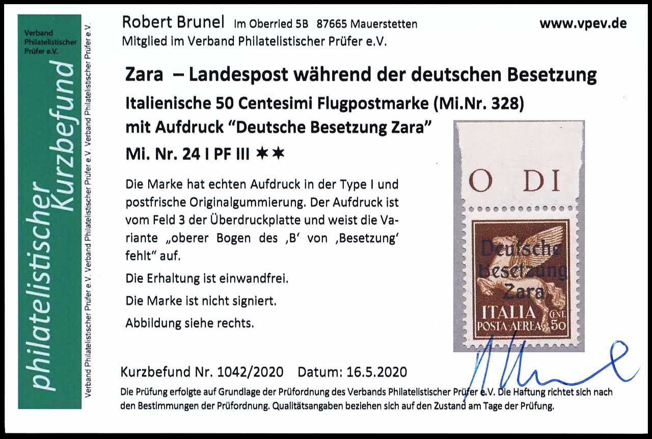 50 Centesimi mit Aufdruck "Deutsche Besetzung Zara", mit Aufdrucktype I, mit Plattenfehler III: "oberer Bogen des B von Besetzung fehlt, Feld 3" , postfrisch, tadellose Erhaltung, Fotobefund Robert Brunel VP (2020) "die Erhaltung ist einwandfrei", Mi. 210.-