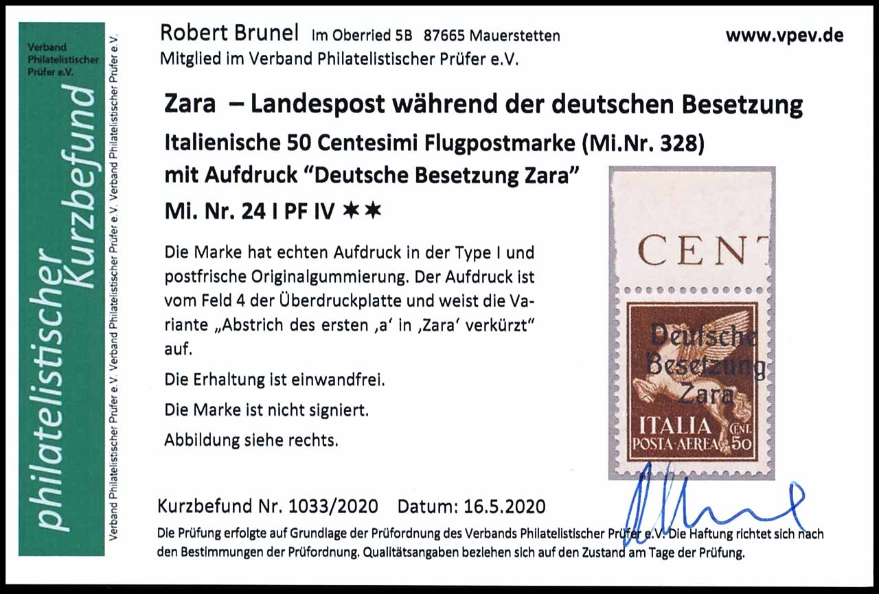 50 Centesimi mit Aufdruck "Deutsche Besetzung Zara", mit Aufdrucktype I, mit Plattenfehler IV: "Abstrich des ersten a in Zara verkürzt", Feld 4", postfrisch, tadellose Erhaltung, Fotobefund Robert Brunel VP (2020) "die Erhaltung ist einwandfrei", Mi. 210.-