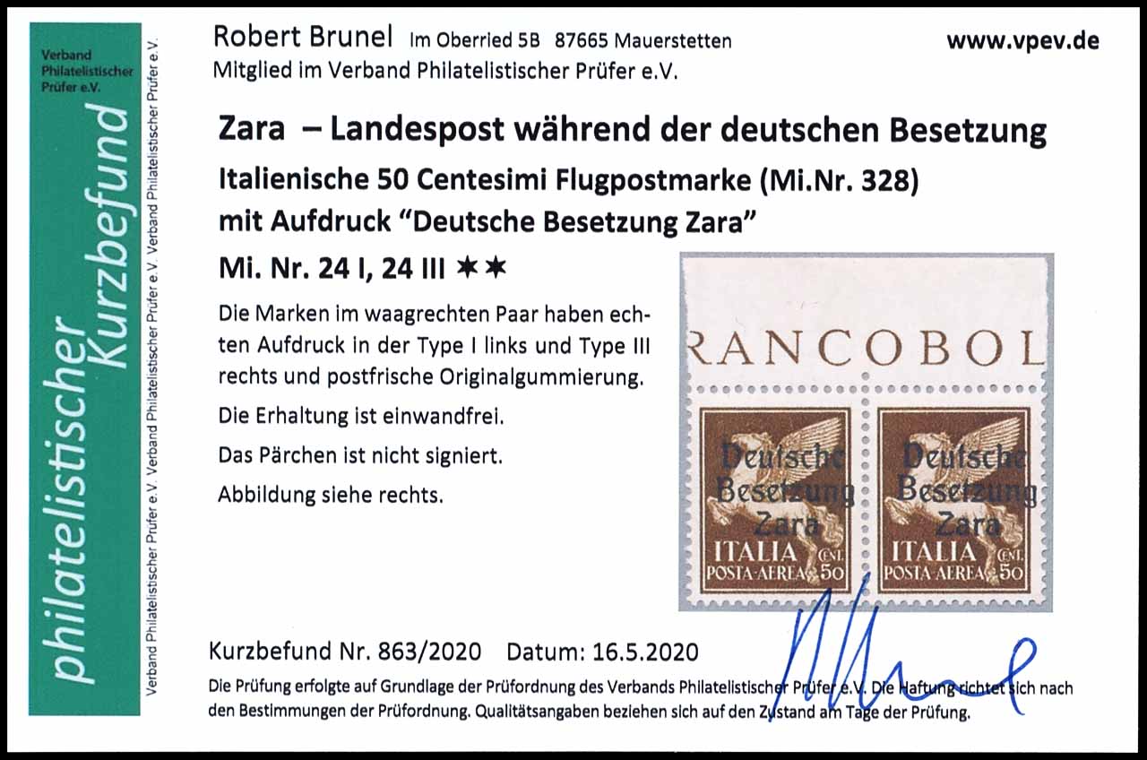 50 Centesimi mit Aufdruck "Deutsche Besetzung Zara", waagrechtes Paar, mit Aufdrucktype I links und Aufdrucktype III rechts, postfrisch, tadellose Erhaltung, Fotobefund Robert Brunel VP (2020) "die Erhaltung ist einwandfrei", Mi. 210.-
