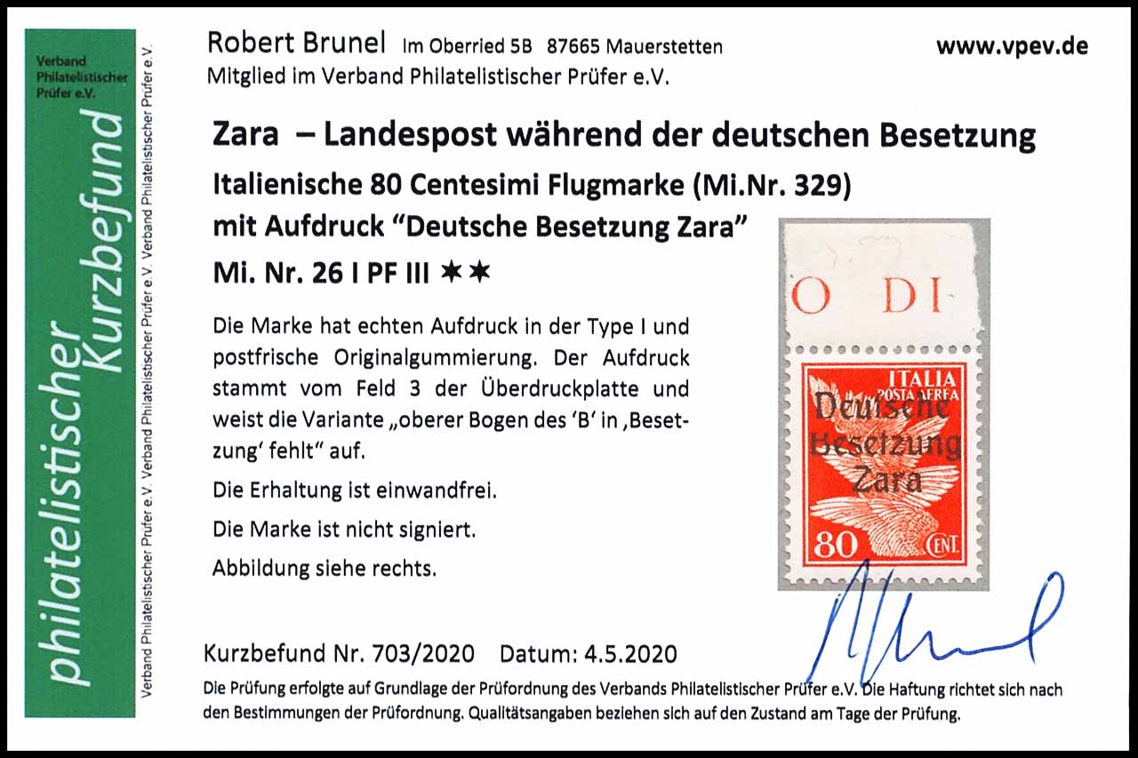 80 Centesimi mit Aufdruck "Deutsche Besetzung Zara", mit Aufdrucktype I, mit Plattenfehler III: "oberer Bogen des B in Besetzung fehlt", Feld 3", postfrisch, tadellose Erhaltung, Fotobefund Robert Brunel VP (2020) "die Erhaltung ist einwandfrei", Mi. 375.-