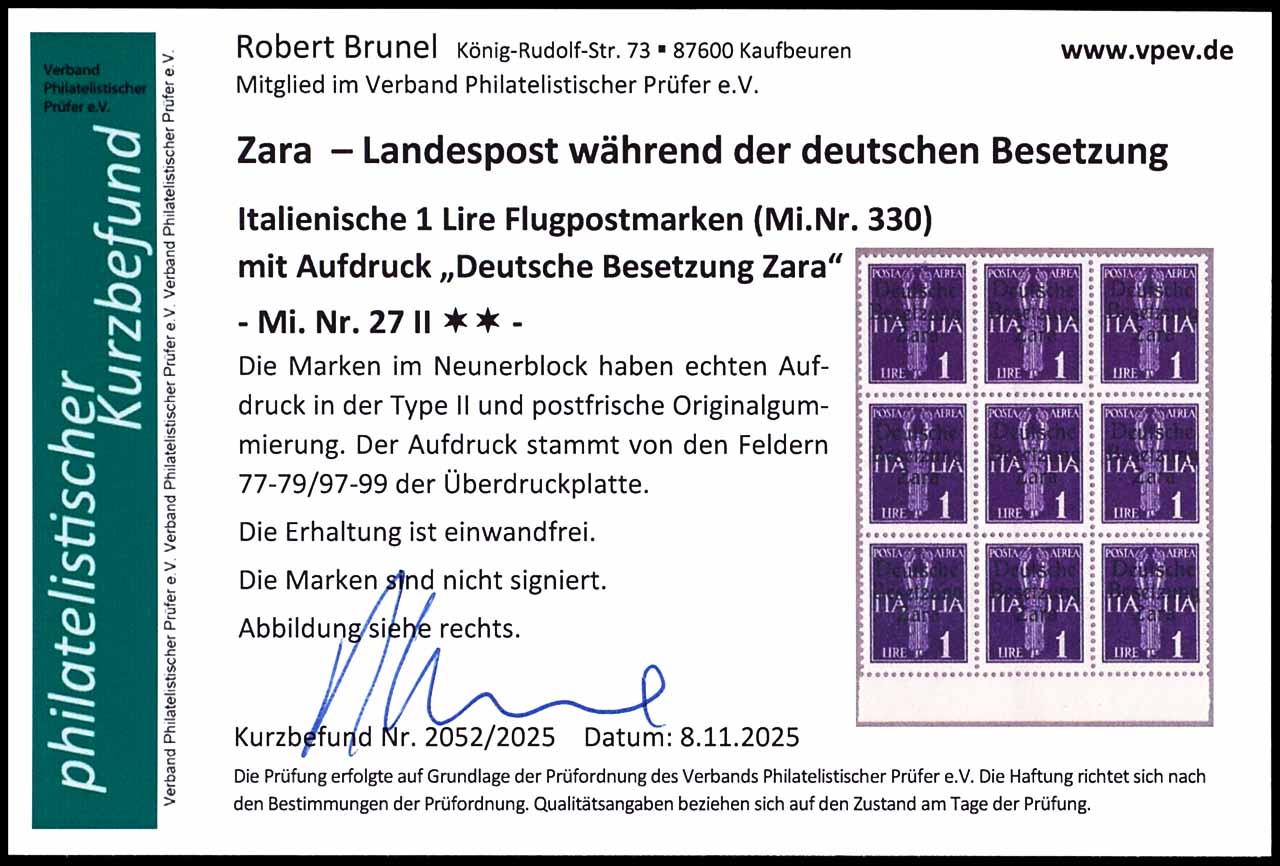 1 Lire Flugpostmarken mit schwarzem Buchdruck-Aufdruck "Deutsche Besetzung in Zara", Bogenteil mit 9 Marken, Aufdrucktype II, Felder 77-79 bis 97-99, postfrische Originalgummierung, tadellos, Expertise Robert Brunel VP (2025) "Die Erhaltung ist einwandfrei", Mi. 360.-