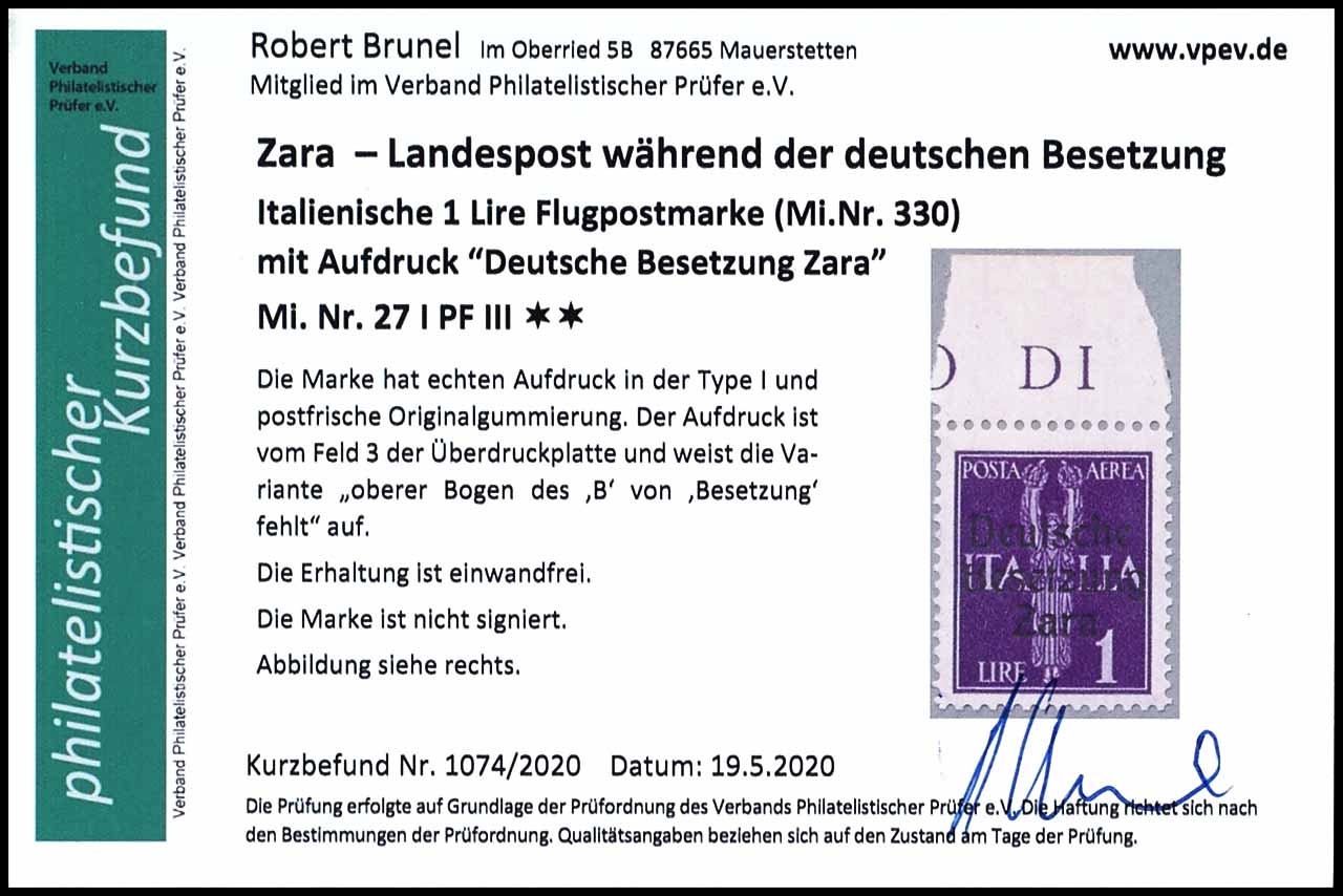 1 Lire mit Aufdruck "Deutsche Besetzung Zara", mit Aufdrucktype I, mit Plattenfehler III: "oberer Bogen des B von Besetzung fehlt, Feld 3" , postfrisch, tadellose Erhaltung, Fotobefund Robert Brunel VP (2020) "die Erhaltung ist einwandfrei", Mi. 200.-