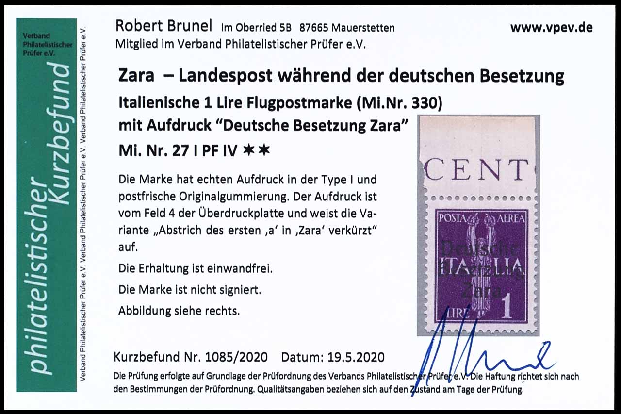 1 Lire mit Aufdruck "Deutsche Besetzung Zara", mit Aufdrucktype I, mit Plattenfehler IV: "a in Zara verkürzt, Feld 4" , postfrisch, tadellose Erhaltung, Fotobefund Robert Brunel VP (2020) "die Erhaltung ist einwandfrei", Mi. 200.-