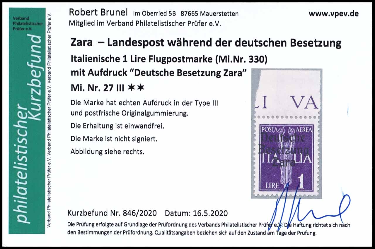 1 Lire mit Aufdruck "Deutsche Besetzung Zara", mit Aufdrucktype III, vom Oberrand, postfrisch, tadellose Erhaltung, Fotobefund Robert Brunel VP (2020) "die Erhaltung ist einwandfrei", Mi. 200.-