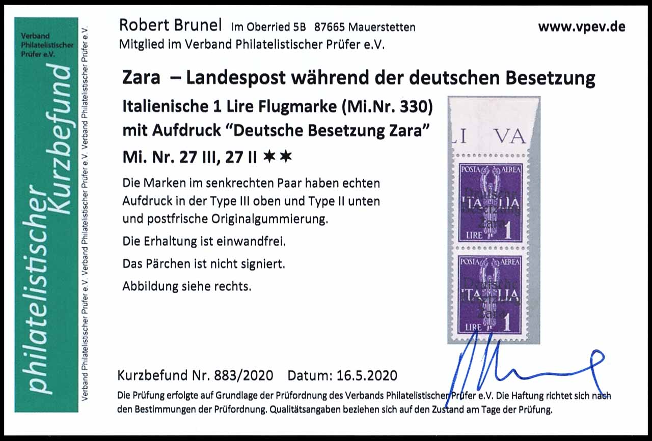 1 Lire mit Aufdruck "Deutsche Besetzung Zara", senkrechtes Paar, mit Aufdrucktype III oben und Aufdrucktype II unten, postfrisch, tadellose Erhaltung, Fotobefund Robert Brunel VP (2020) "die Erhaltung ist einwandfrei", Mi. 240.-