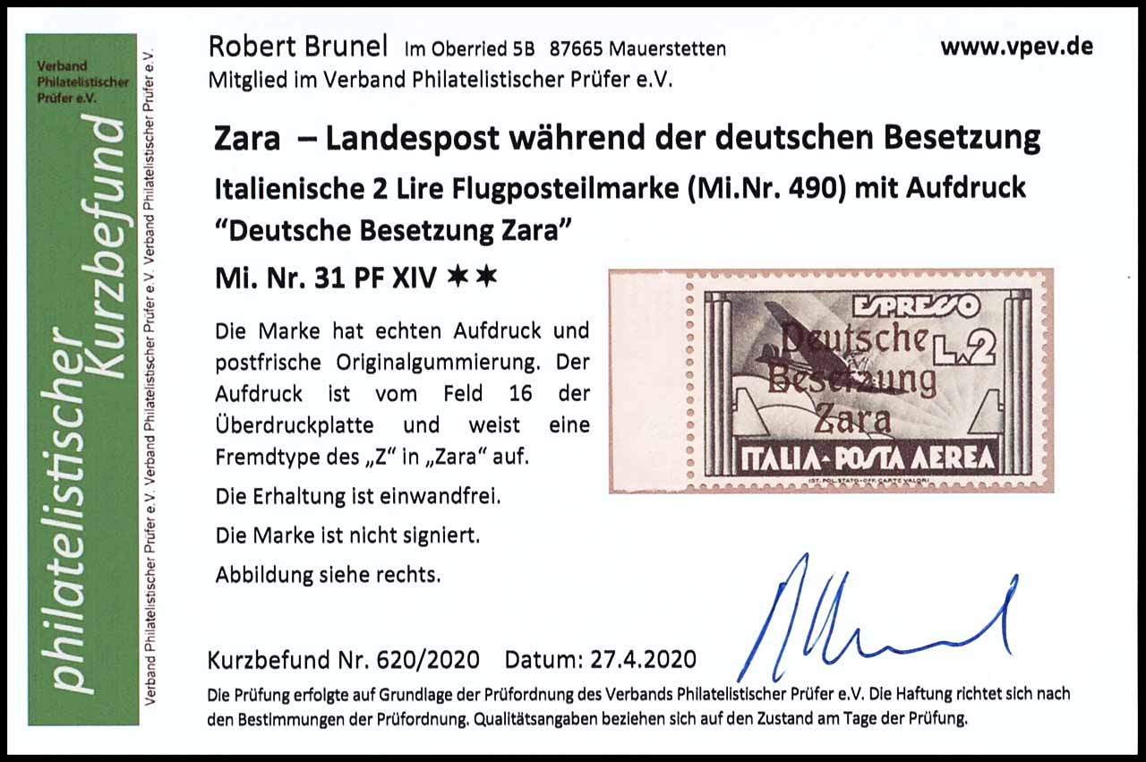 2 Lire mit Aufdruck "Deutsche Besetzung Zara", mit Plattenfehler XIV "Fremdtype des Z in Zara, Feld 16, postfrisch, tadellose Erhaltung, Fotobefund Robert Brunel VP (2020) "die Erhaltung ist einwandfrei", Mi. 240.-