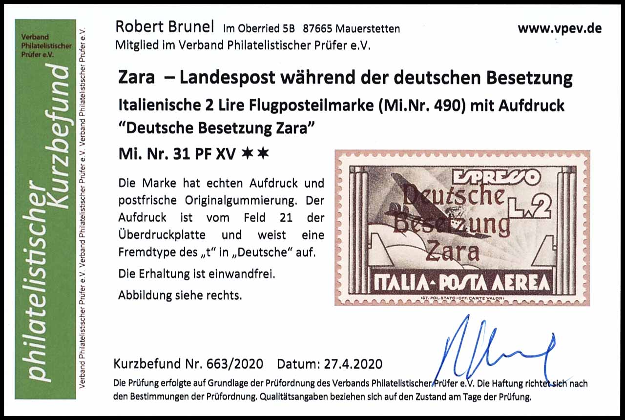 2 Lire mit Aufdruck "Deutsche Besetzung Zara", mit Plattenfehler XV "Fremdtype des t in Deutsche", Feld 21, postfrisch, tadellose Erhaltung, Fotobefund Robert Brunel VP (2020) "die Erhaltung ist einwandfrei", Mi. 240.-