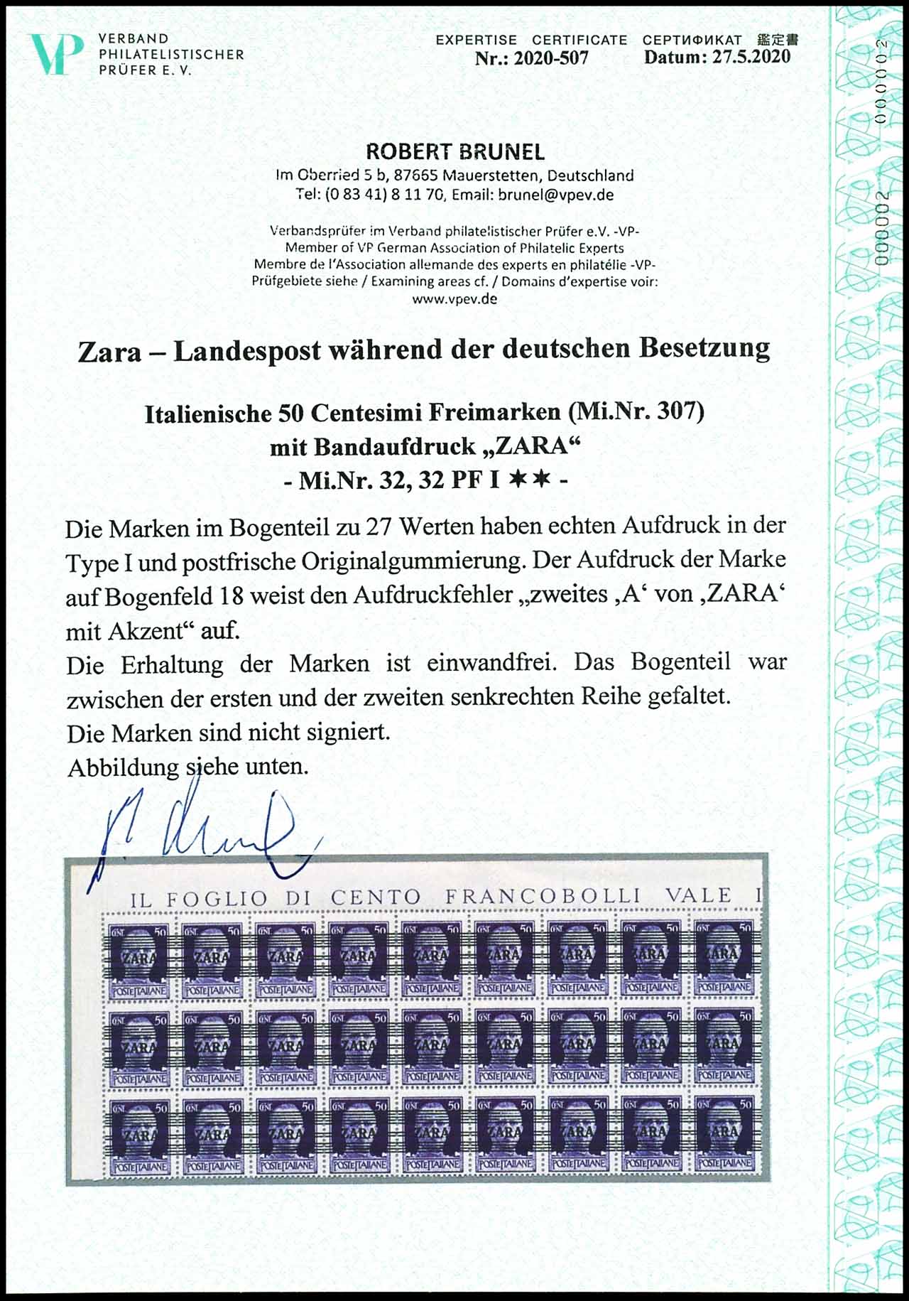 50 Centisimi mit Bandaufdruck "ZARA", Bogenteil zu 27 Marken, die Marke von Bogenfeld 18 weist den Plattenfehler I auf: "zweites A von ZARA mit Akzent", das Bogenteil war zwischen der ersten und zweiten senkrechten Reihe gefaltet, tadellose Erhaltung, Expertise Robert Brunel VP (2020) "die Erhaltung ist einwandfrei", Mi. 1.350.-