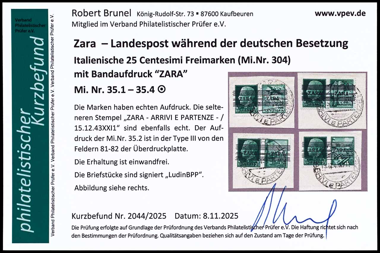 25 Centesimi mit Bandaufdruck "ZARA", auf kleinen Briefstücken, Aufdruck der MiNr. 35.2 in Type III von Bogenfeld 81-82, restliche Marken Aufdrucktype I, alle vier Propagandafelder, entwertet mit Stempel "ZARA - ARRIVI E PARTENZE - 15.12.43 XXI 1", tadellos, geprüft Ludin BPP, Fotobefund Robert Brunel VP (2025) "Die Erhaltung ist einwandfrei", Mi. 180.-