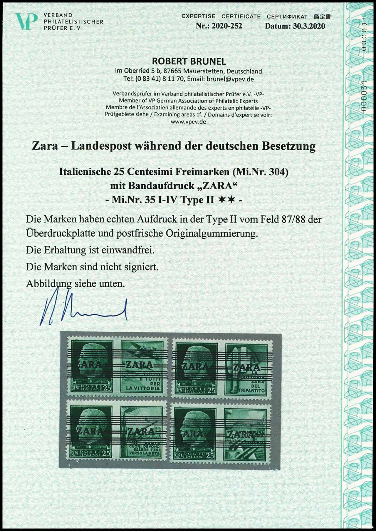 25 Centesimi mit Bandaufdruck "Zara", alle 4 Propagandafelder, alle Marken Aufdrucktype II, von Bogenfeld 87/88, postfrisch, tadellose Erhaltung, unsigniert, Expertise Robert Brunel VP (2020) "Die Erhaltung ist einwandfrei", Mi. 960.-