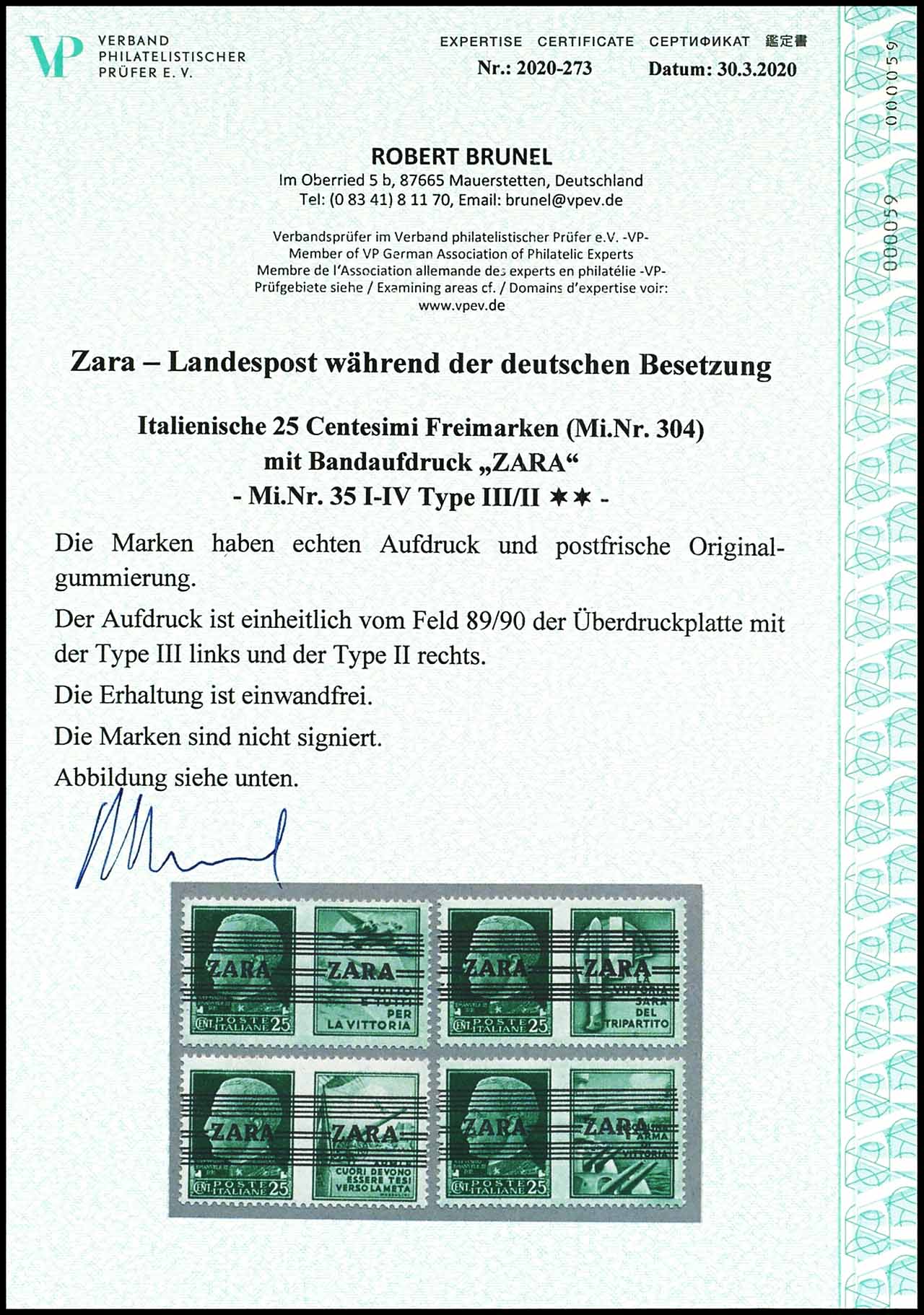 25 Centesimi mit Bandaufdruck "Zara", alle 4 Propagandafelder, alle Marken Aufdrucktype III links und Aufdrucktype II rechts, von Bogenfeld 89/90, jeweils postfrisch, tadellose Erhaltung, unsigniert, Expertise Robert Brunel VP (2020) "Die Erhaltung ist einwandfrei", Mi. 960.-