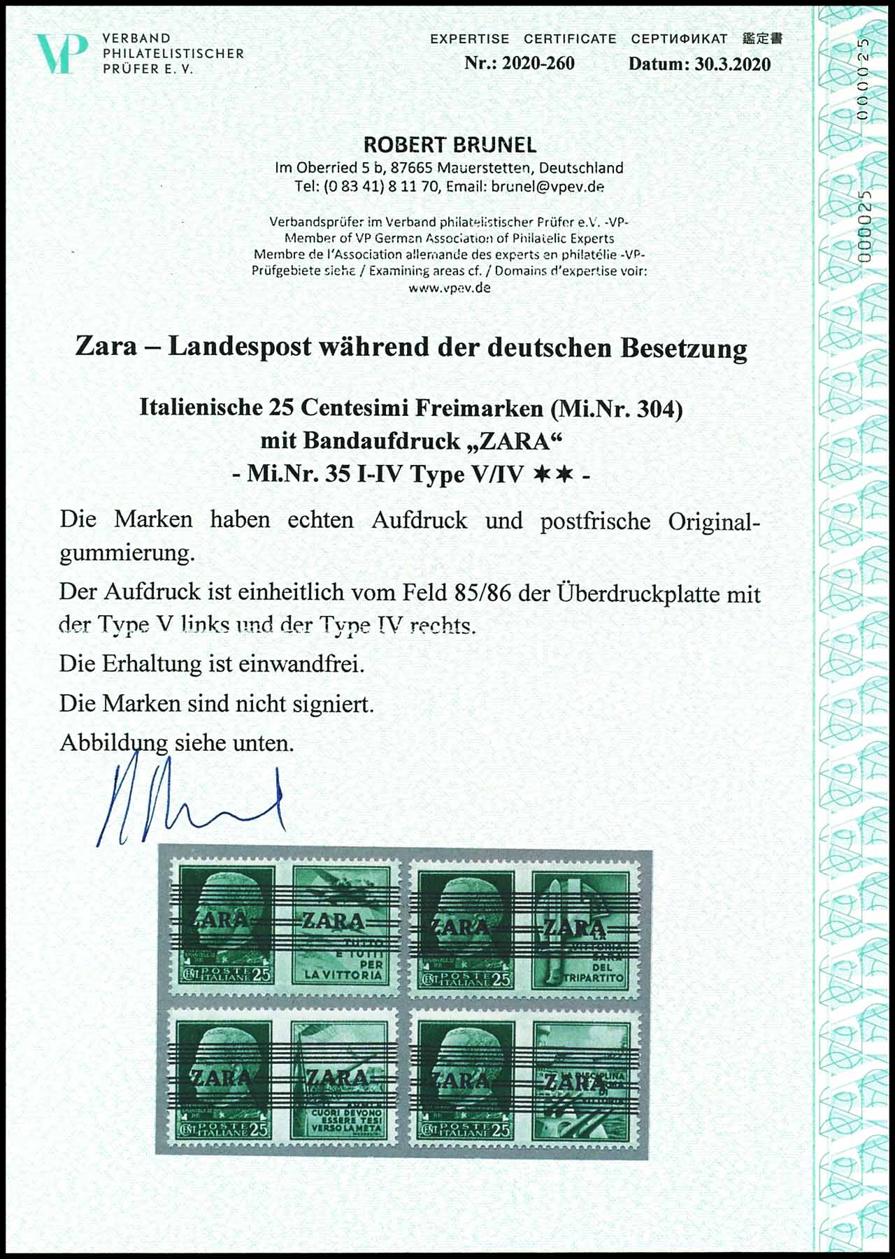 25 Centesimi mit Bandaufdruck "Zara", alle 4 Propagandafelder, MiNr. 35 in Type V links und Type IV rechts, jeweils von Bogenfeld 85/86, postfrisch, tadellose Erhaltung, unsigniert, Expertise Robert Brunel VP (2020) "Die Erhaltung ist einwandfrei", Mi. 1.440.-