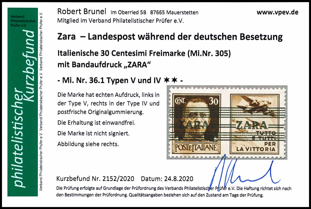 30 Centesimi mit Bandaufdruck "Zara", Propagandafeld 3 = Flugzeug, MiNr. 36.1 Aufdrucktype V links und Aufdrucktype IV rechts, postfrisch, tadellose Erhaltung, Fotobefund Robert Brunel VP (2020) "die Erhaltung ist einwandfrei", Mi. 360.-