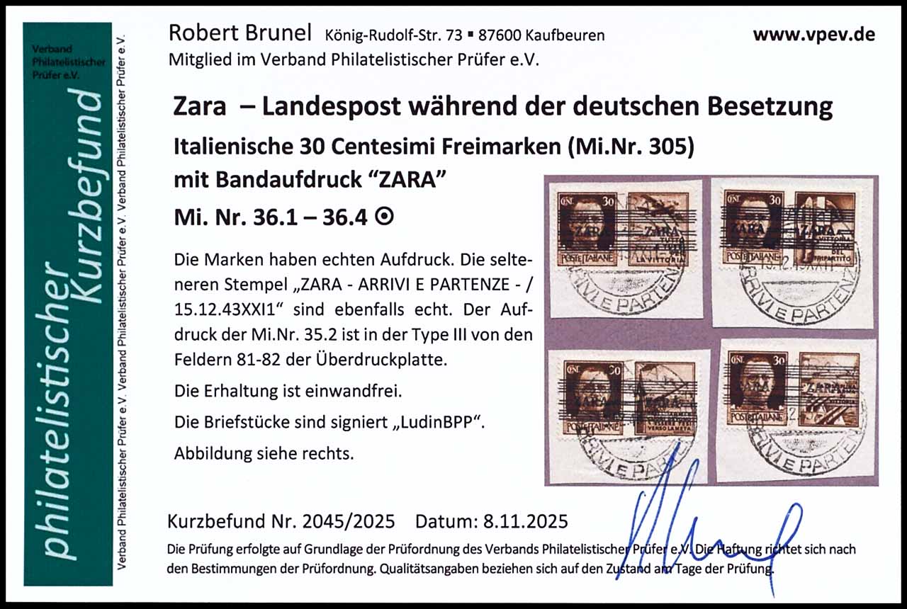 30 Centesimi mit Bandaufdruck "ZARA", auf kleinen Briefstücken, Aufdruck der MiNr. 36.2 in Type III von Bogenfeld 81-82, restliche Marken Aufdrucktype I, alle vier Propagandafelder, entwertet mit Stempel "ZARA - ARRIVI E PARTENZE - 15.12.43 XXI 1", tadellos, geprüft Ludin BPP, Fotobefund Robert Brunel VP (2025) "Die Erhaltung ist einwandfrei", Mi. 180.-