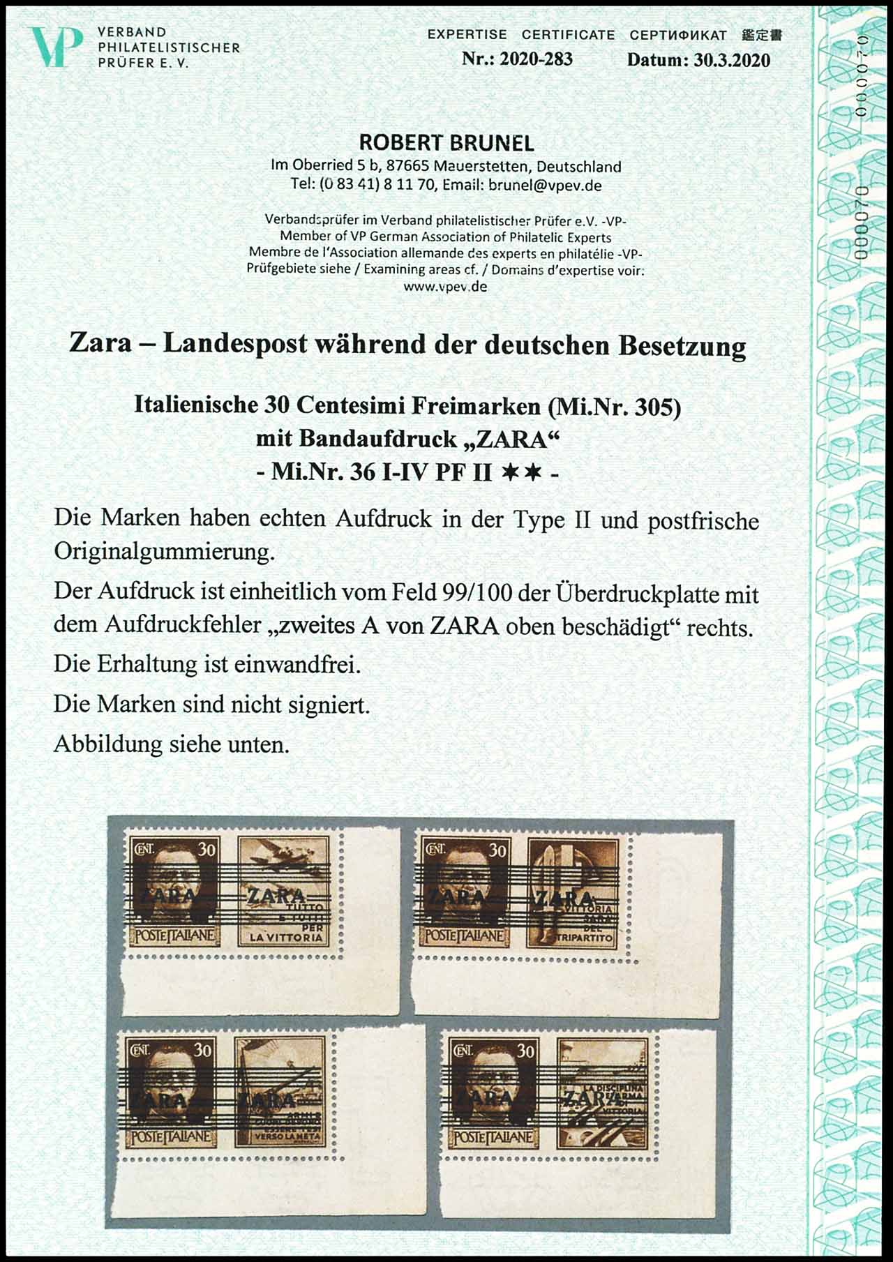 30 Centesimi mit Bandaufdruck "Zara", alle 4 Propagandafelder, alle Marken Aufdrucktype II mit Aufdruckfehler II: "zweites A von ZARA oben beschädigt, Feld 100", jeweils postfrisch, tadellose Erhaltung, Expertise Robert Brunel VP (2020) "die Erhaltung ist einwandfrei", Mi. 1.200.-
