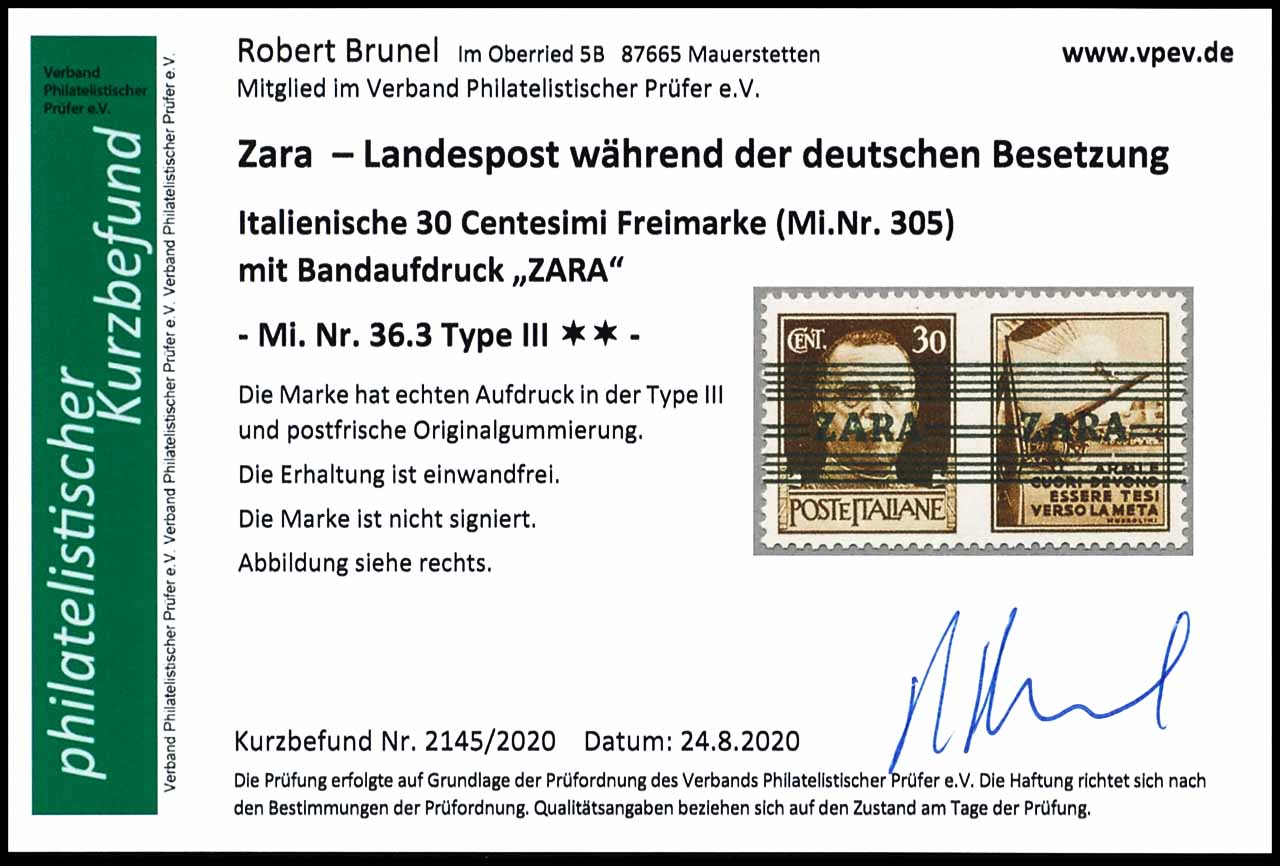 30 Centesimi mit Bandaufdruck "Zara", Propagandafeld2=Artillerie, MiNr. 36.3 Aufdrucktype III, postfrisch, tadellose Erhaltung, Fotobefund Robert Brunel VP (2020) "die Erhaltung ist einwandfrei", Mi. 240.-