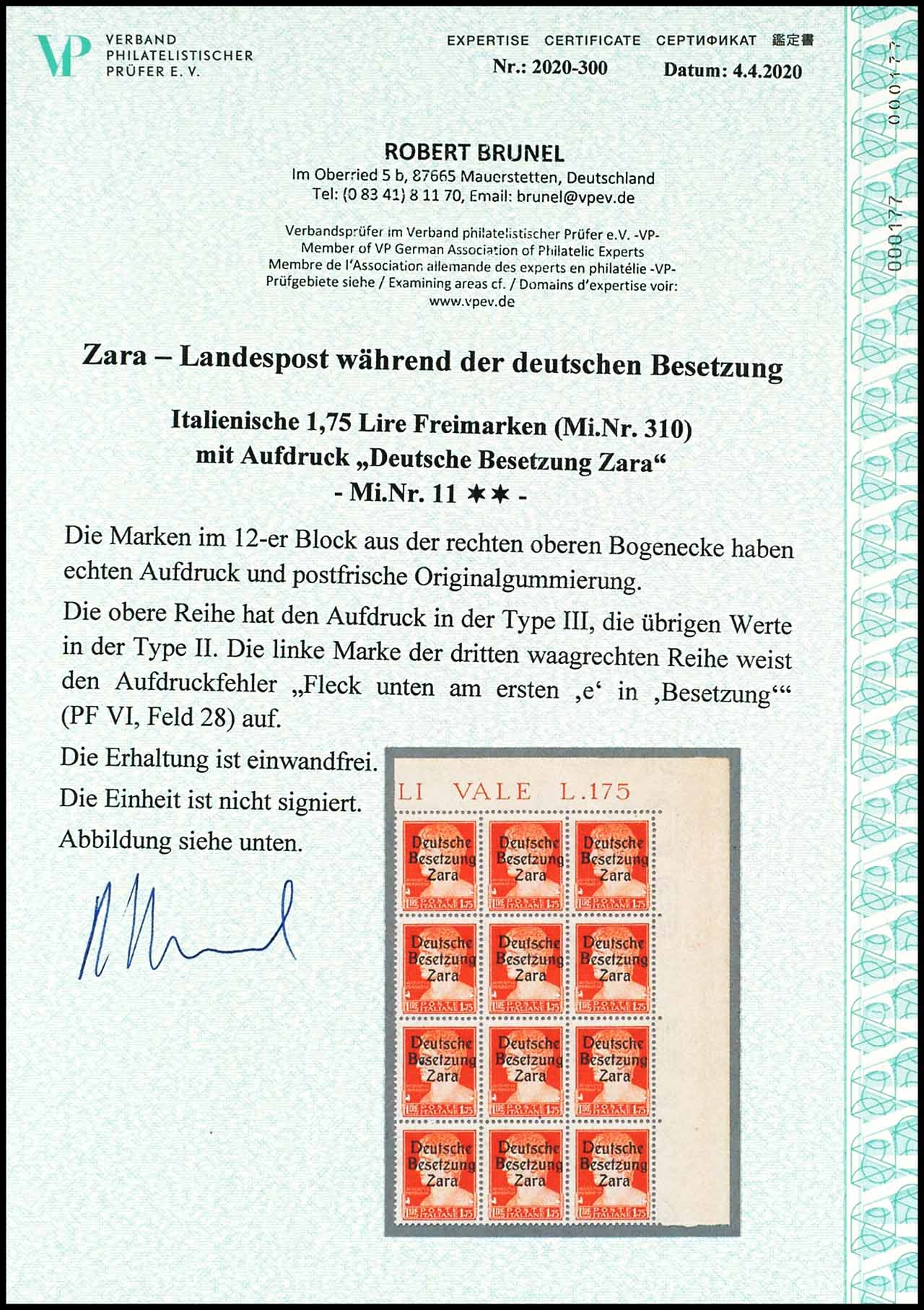 1,75 Lire mit Aufdruck "Deutsche Besetzung Zara", Bogenteil zu 12 Marken aus der rechten oberen Bogenecke, die oberen drei Marken weisen Aufdrucktype III auf, die restlichen Marken Aufdrucktype II, die linke Marke der dritten Reihe weist den Aufdruckfehler VI auf "Fleck unten am ersten "e" in "Besetzung, Feld 28", tadellose Erhaltung, unsigniert, Expertise Robert Brunel VP (2020) "die Erhaltung ist einwandfrei", Mi. 1.200.-+