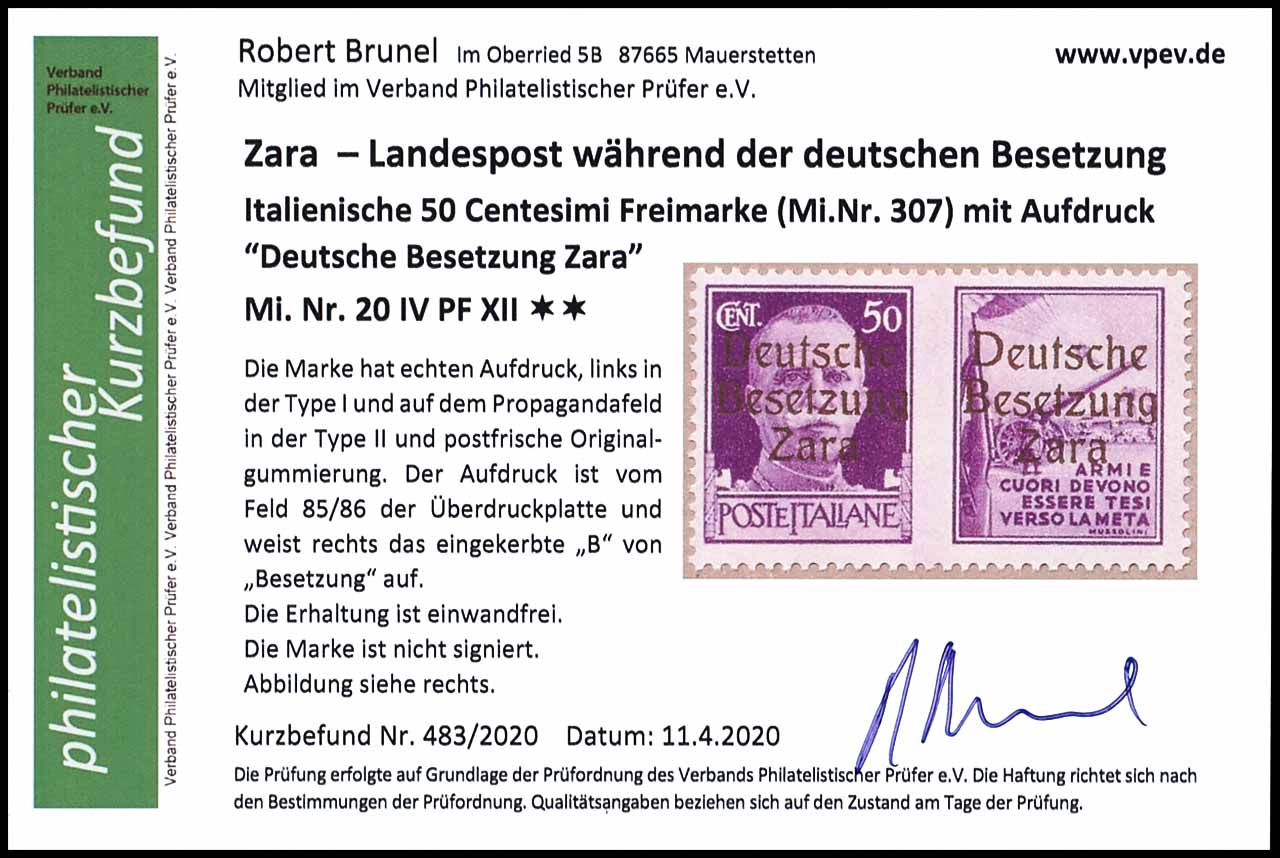 50 Centesimi mit Aufdruck "Deutsche Besetzung Zara", mit Propagandafeld2=Artillerie, Marke mit Aufdrucktype I und Propagandafeld mit Aufdrucktype II, Bogenfeld 85-86, mit Aufdruckfehler XII "eingekerbtes B von Besetzung", postfrische Erhaltung, unsigniert, Fotobefund Robert Brunel VP (2020) "die Erhaltung ist einwandfrei", Mi. 600.-++