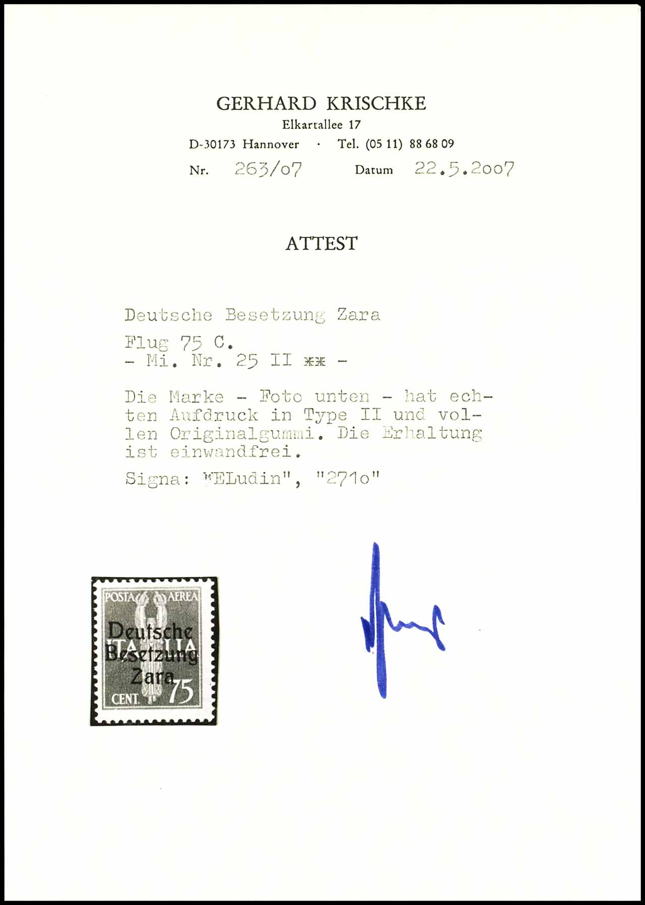 75 Centesimi mit Aufdruck "Deutsche Besetzung Zara", mit Aufdrucktype II, postfrisch, tadellose Erhaltung, signiert "E Ludin" "2710", Attest Gerhard Krischke (2007), "die Erhaltung ist einwandfrei", Mi. 650.-