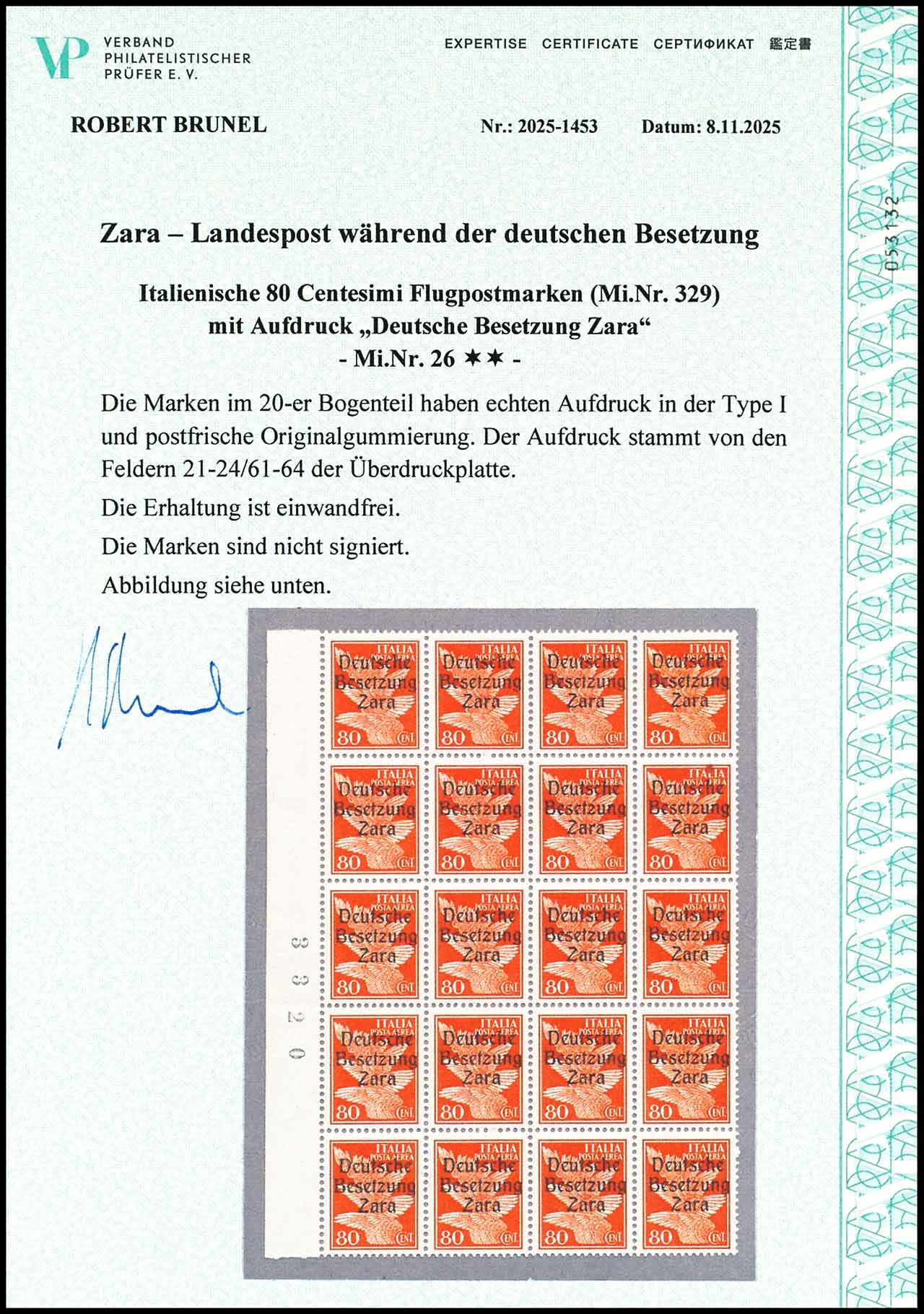 80 Centesimi Flugpostmarken mit schwarzem Buchdruck-Aufdruck "Deutsche Besetzung in Zara", Bogenteil mit 20 Marken, Felder 21-24 bis 61-64, Type I, postfrische Originalgummierung, tadellos, unsigniert, Expertise Robert Brunel VP (2025) "Die Erhaltung ist einwandfrei", Mi. 1.500.-