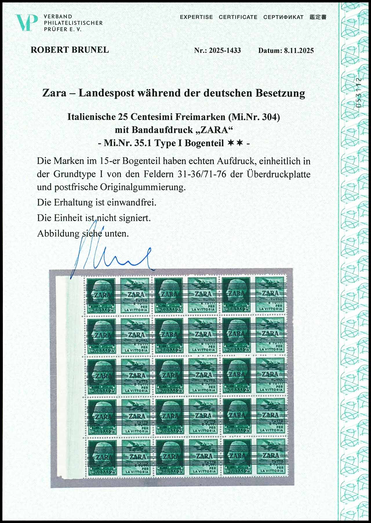 25 Centesimi mit Bandaufdruck "ZARA", Bogenteil mit 15 Marken, Aufdrucktype I, MiNr. 35.1 Propagandafeld3=Flugzeug, Felder 31-36 bis 71-76, postfrische Originalgummierung, tadellos, unsigniert, Expertise Robert Brunel VP (2025) "Die Erhaltung ist einwandfrei", Mi. 900.-