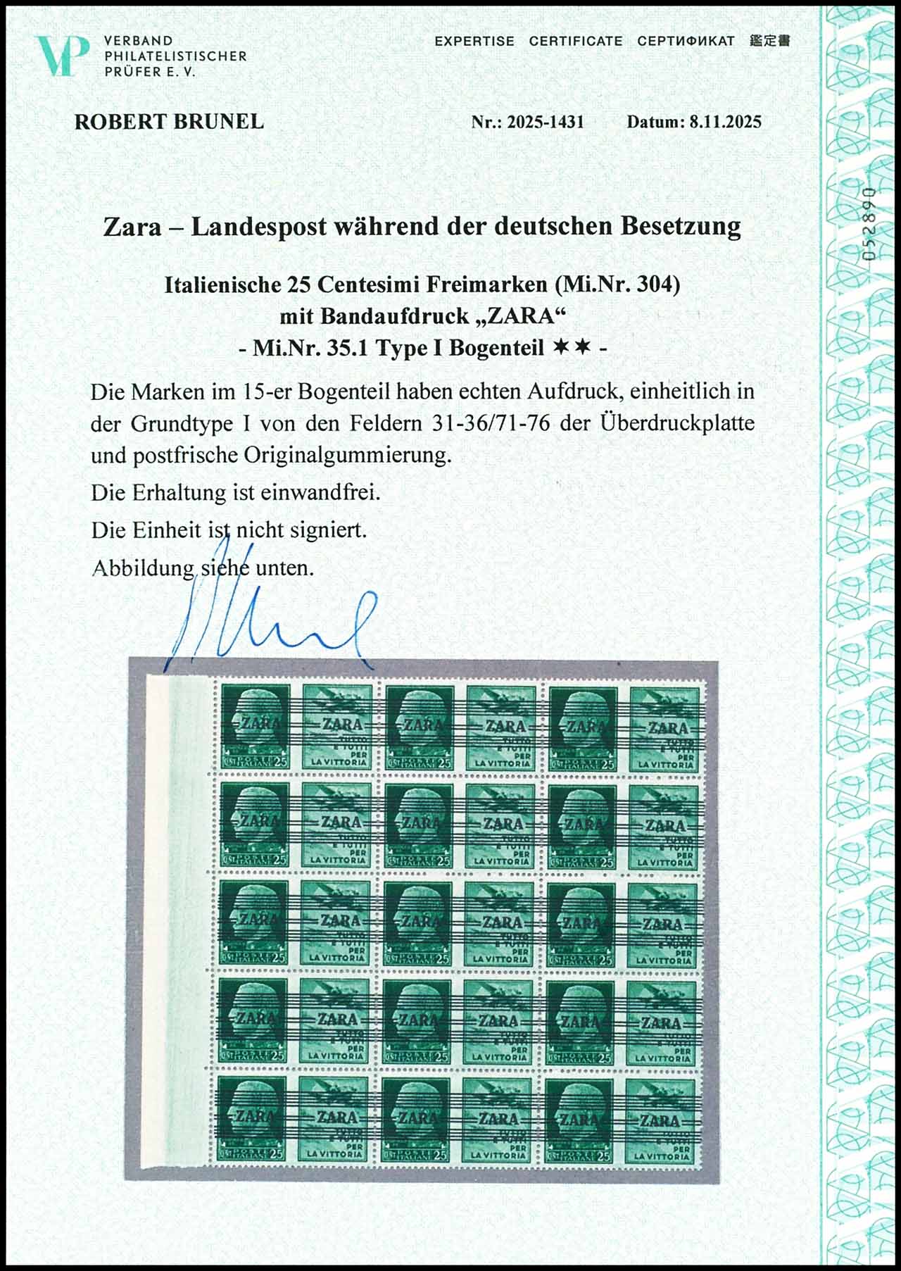 25 Centesimi mit Bandaufdruck "ZARA", Bogenteil mit 15 Marken, Aufdrucktype I, Propagandafeld 3 = Flugzeug, Felder 31-36 bis 71-76, postfrische Originalgummierung, tadellos, unsigniert, Expertise Robert Brunel VP (2025) "Die Erhaltung ist einwandfrei", Mi. 900.-