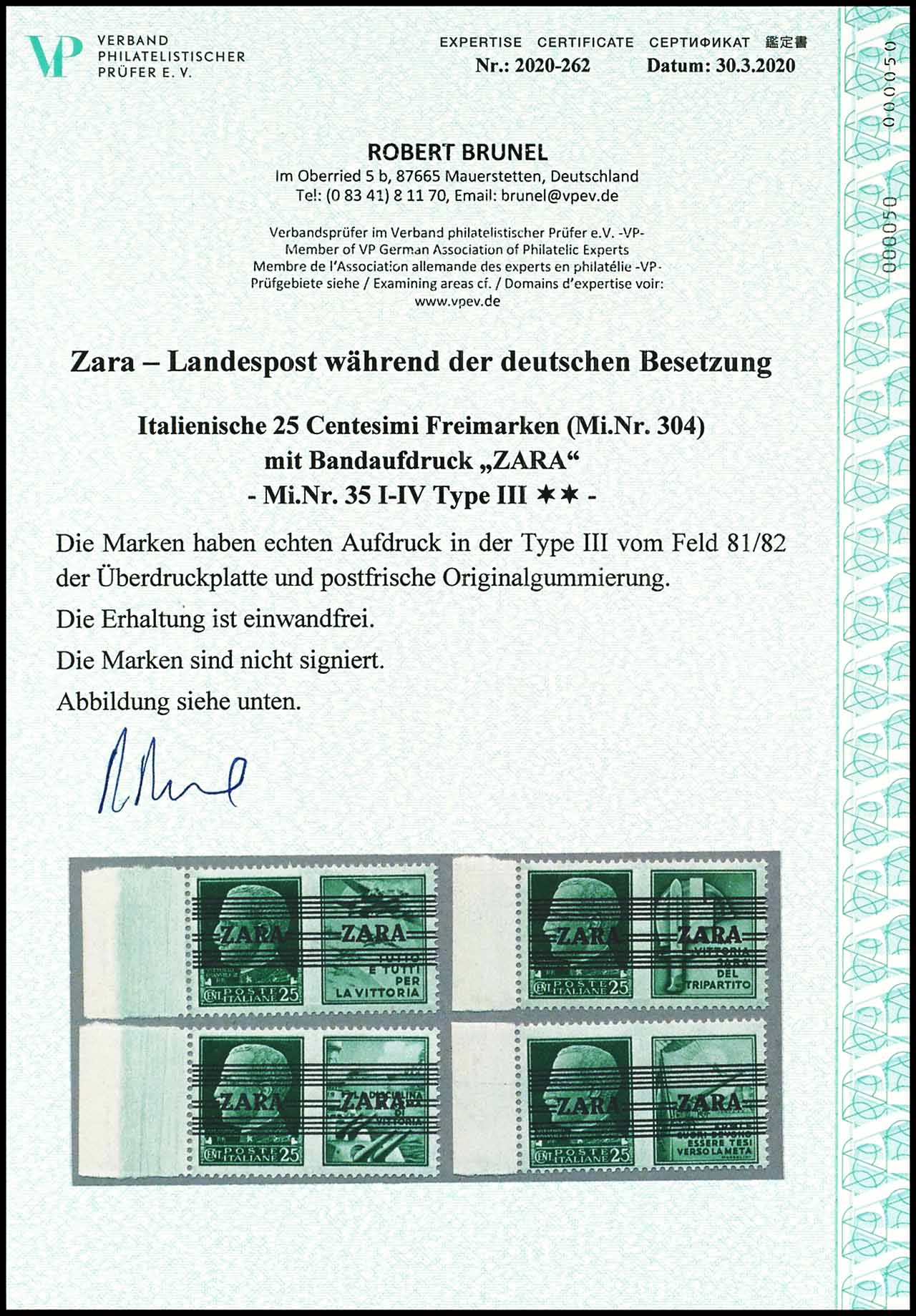 25 Centesimi mit Bandaufdruck "Zara", alle 4 Propagandafelder, Type III, jeweils von Bogenfeld 81/82, postfrisch, tadellose Erhaltung, unsigniert, Expertise Robert Brunel VP (2020) "Die Erhaltung ist einwandfrei", Mi. 960.-