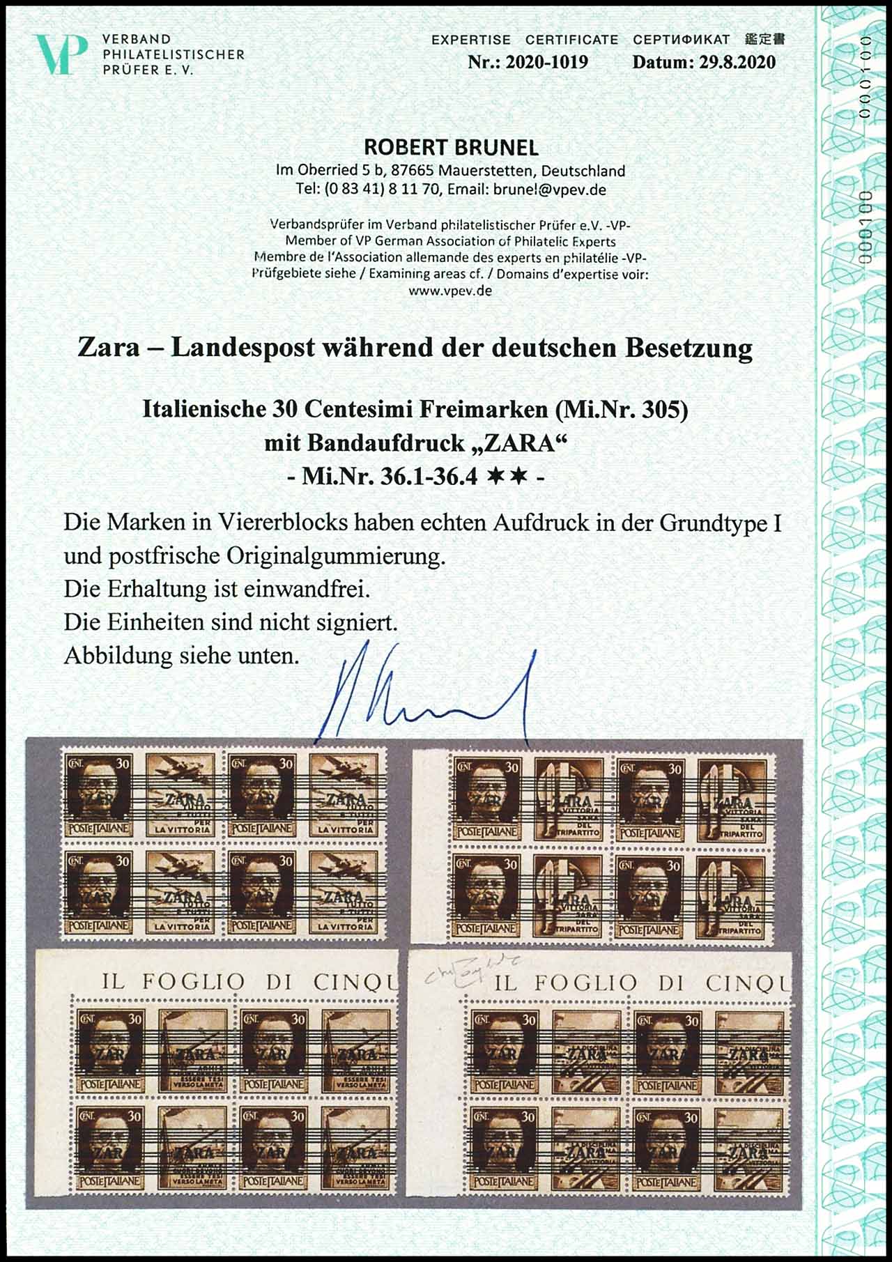 30 Centesimi mit Bandaufdruck "Zara", alle 4 Propagandafelder, jeweils im Viererblock, alle Marken Aufdrucktype I, jeweils postfrisch, tadellose Erhaltung, unsigniert, Expertise Robert Brunel VP (2020) "Die Erhaltung ist einwandfrei", Mi. 960.-