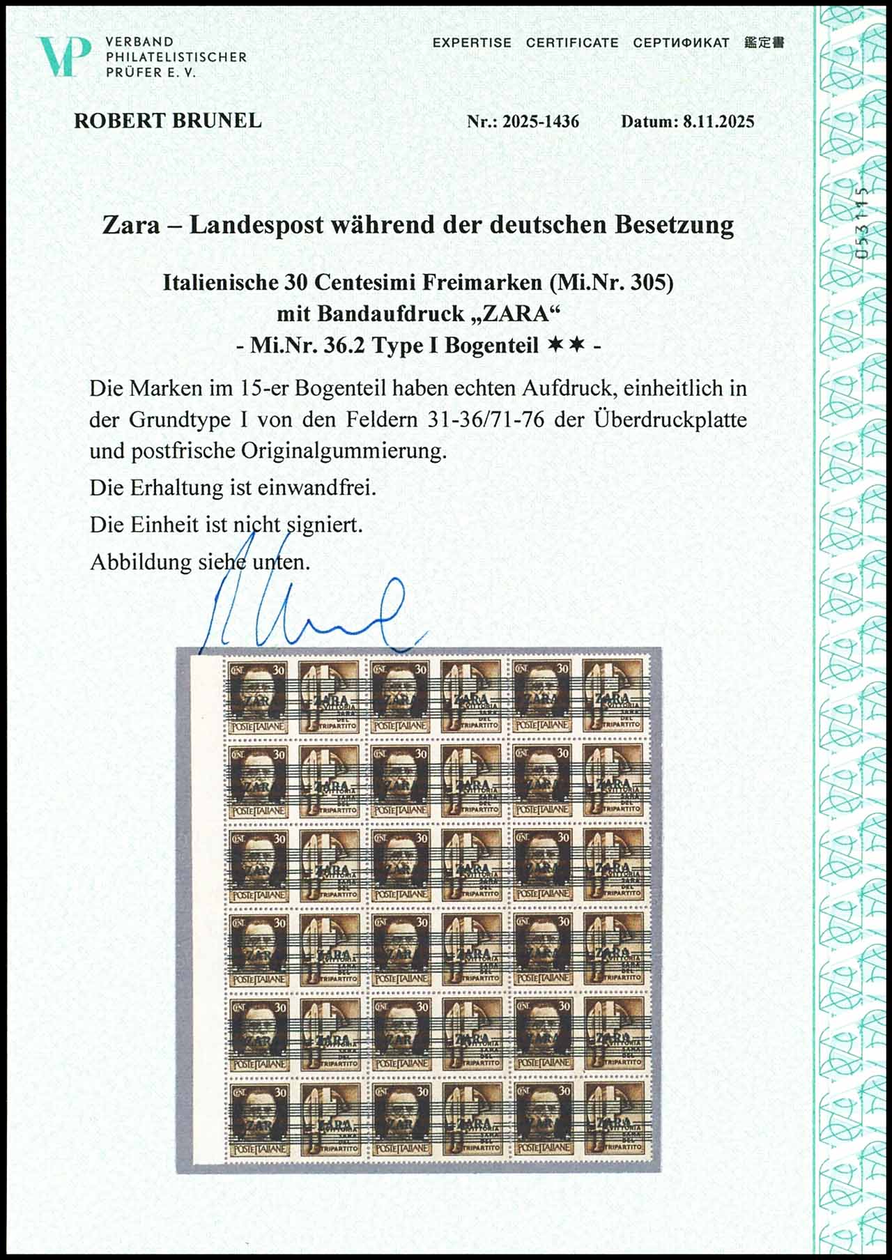 30 Centesimi mit Bandaufdruck "ZARA", Bogenteil mit 15 Marken, Aufdrucktype I, MiNr. 36.4 Propagandafeld4=Stahlhelm, Felder 31-36 bis 71-76, postfrische Originalgummierung, tadellos, unsigniert, Expertise Robert Brunel VP (2025) "Die Erhaltung ist einwandfrei", Mi. 900.-