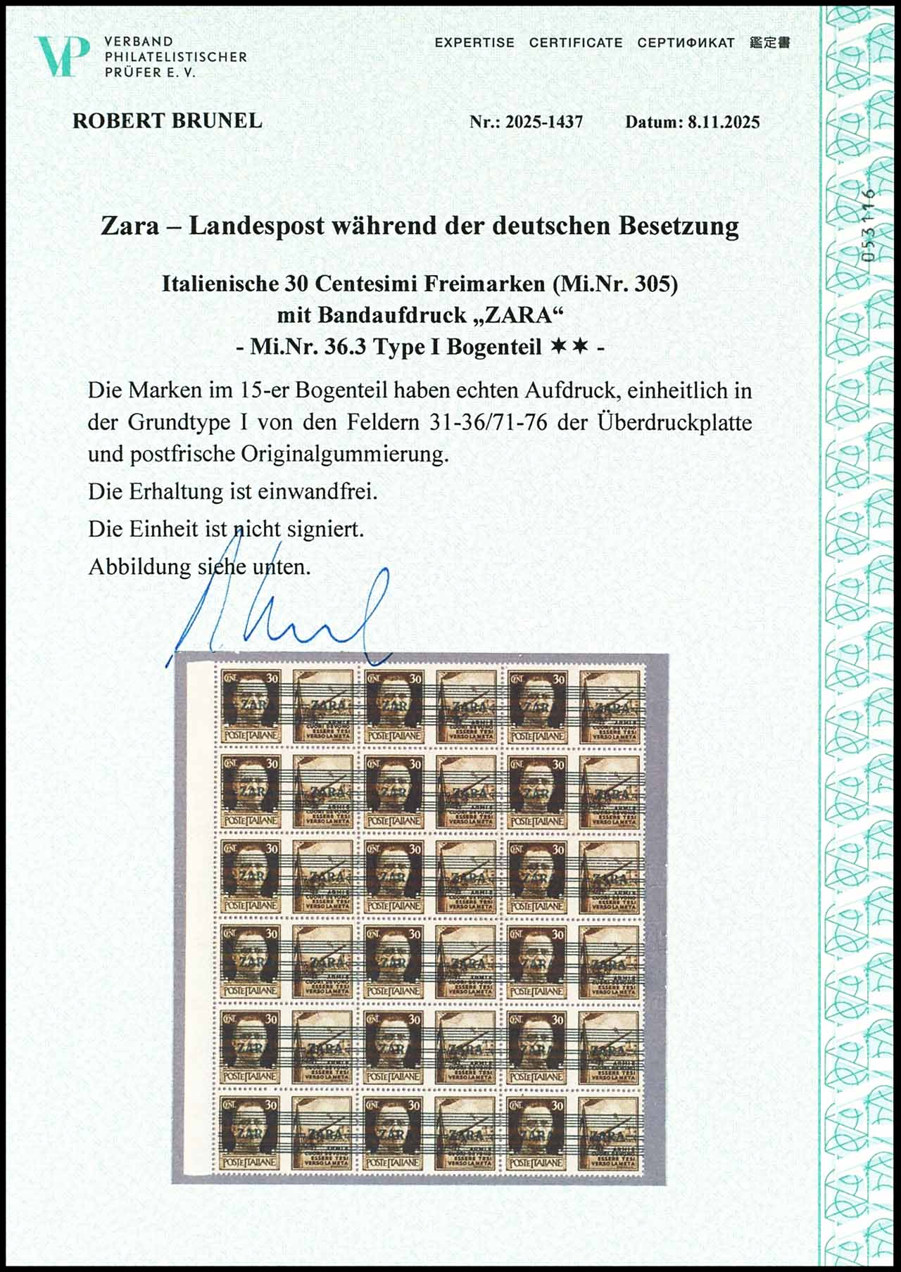 30 Centesimi mit Bandaufdruck "ZARA", Bogenteil mit 15 Marken, Aufdrucktype I, MiNr. 36.3 Propagandafeld2=Artillerie, Felder 31-36 bis 71-76, postfrische Originalgummierung, tadellos, unsigniert, Expertise Robert Brunel VP (2025) "Die Erhaltung ist einwandfrei", Mi. 900.-