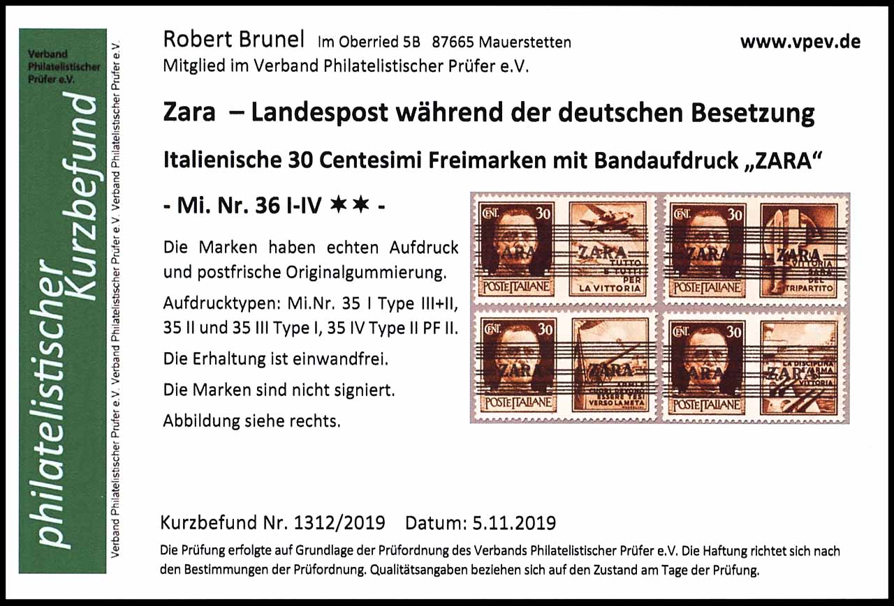 30 Centesimi mit Bandaufdruck "Zara", alle 4 Propagandafelder, MiNr. 36I Typenpaar III + II, 36II und 36III Type I und 36IV Type II mit Aufdruckfehler II "zweites A von ZARA oben beschädigt, Feld 100", jeweils postfrisch, tadellose Erhaltung, unsigniert, Fotobefund Robert Brunel VP (2019), "die Erhaltung ist einwandfrei", Mi. 720.-+