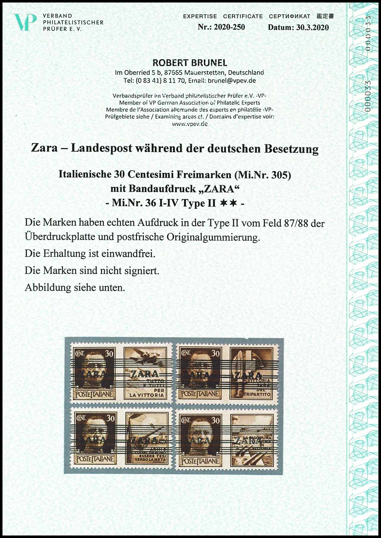 30 Centesimi mit Bandaufdruck "Zara", alle 4 Propagandafelder, alle Marken Aufdrucktype II, Feld 87/88 jeweils postfrisch, tadellose Erhaltung, unsigniert, Expertise Robert Brunel VP (2020) "Die Erhaltung ist einwandfrei", Mi. 960.-