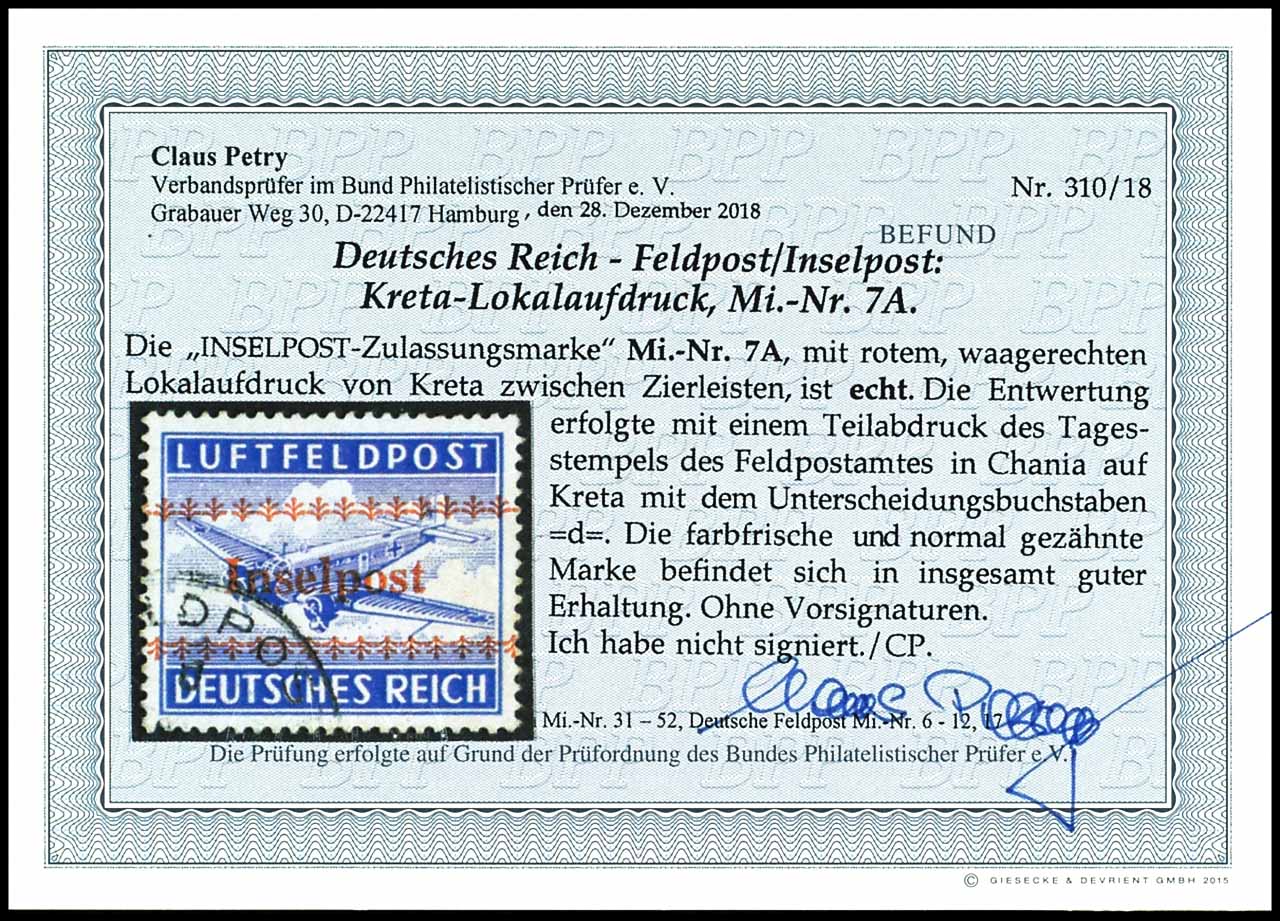 Insel Kreta, Zulassungsmarke gezähnt, gestempelt mit Tagesstempel des Feldpostamtes in Chiania auf Kreta mit Unterscheidungsbuchstaben =d=, gute Erhaltung, Fotobefund Claus Petry BPP, Mi. 350.-