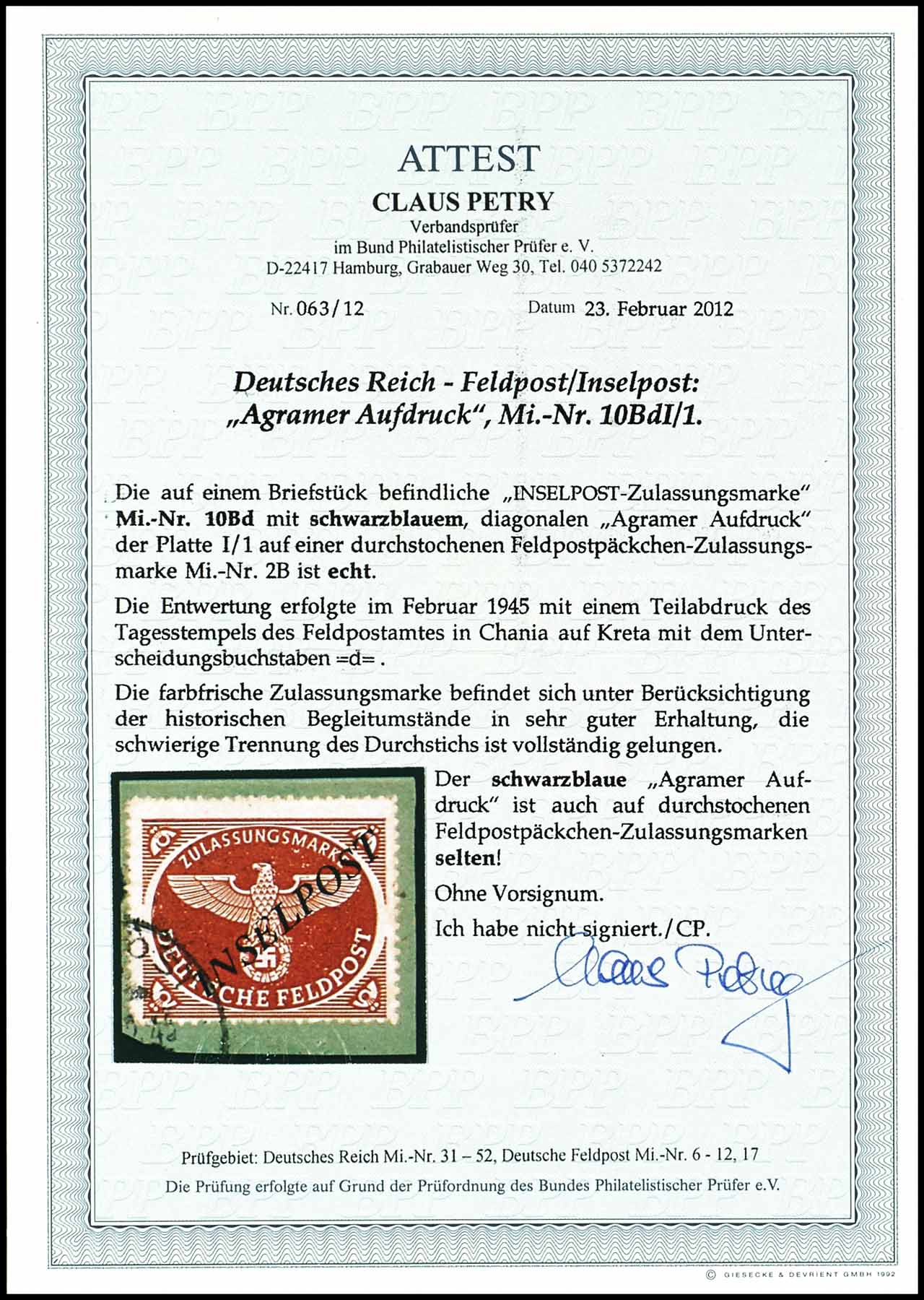 Agramer Aufdruck, Feldpostzulassungsmarke durchstochen, Aufdruckfarbe schwarzblau, Platte I/1, entwertet mit Tagesstempel des Feldpostamtes in Chania auf Kreta mit dem Unterscheidungsbuchstaben =d= , Attest Claus Petry BPP (2012) "in sehr guter Erhaltung", Mi. 500.-