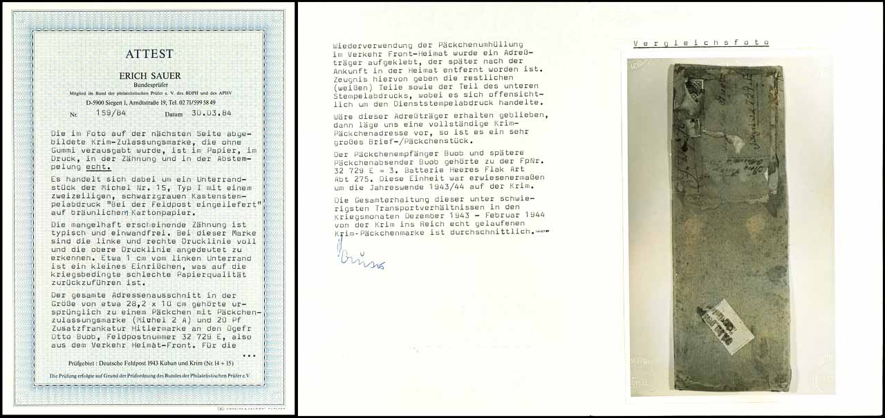 Krim, Zulassungsmarke in Type I zusammen mit Fragmenten der Zusatzfrankatur 20 Pfg Hitler (Mi.Nr.791) und Päckchenzulassungsmarke (Mi.Nr.2A) auf bräunlichem Kartonpapier, Marke vom Unterrand mit einem zweizeiligen Kastenstempelabdruck (in schwarzgrau!) "Bei der Feldpost eingeliefert", Marke und Stempel sind echt, der Päckchenempfänger Buob und spätere Päckchenabsender gehörte zu der FpNr. 32 729 E= 3. Batterie Heeres Flak Art Abt 275. Diese Einheit war erwiesenermaßen um die Jahreswende 1943/44 auf der Krim, der aufgeklebte Adressträger wurde nach der Ankunft in der Heimat entfernt, so dass wir hier von einem großem Brief-/Päckchenstück ausgehen, echt gelaufen, selten, signiert Sauer BPP und Fotoattest Erich Sauer BPP "Die Gesamterhaltung dieser unter schwierigsten Transportverhältnissen in den Kriegsmonaten Dezember 1943-Februar 1944 von der Krim ins Reich echt gelaufenen Krim-Päckchenmarke ist durchschnittlich."