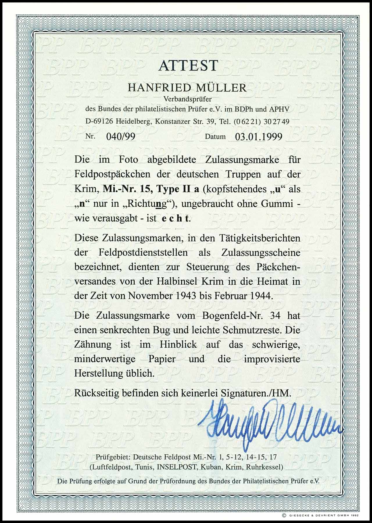 Krim, Zulassungsmarke in Type II (kopfstehendes "u" als "n" nur in "Richtung"), Bogenfeld 34, wie verausgabt ohne Gummierung, die Marke weist einen senkrechten Bug und leichte Schmutzreste auf, im Hinblick auf die historischen Begleitumstände befindet sich die Marke in durchschnittlicher Erhaltung, als Beigabe zu dieser Ausgabe ein Taschen-Kalender für 1944, unsigniert und Fotoattest Hanfried Müller BPP (1999):" .. ungebraucht ohne Gummi- wie verausgabt- ist echt.", Mi.1.600.-