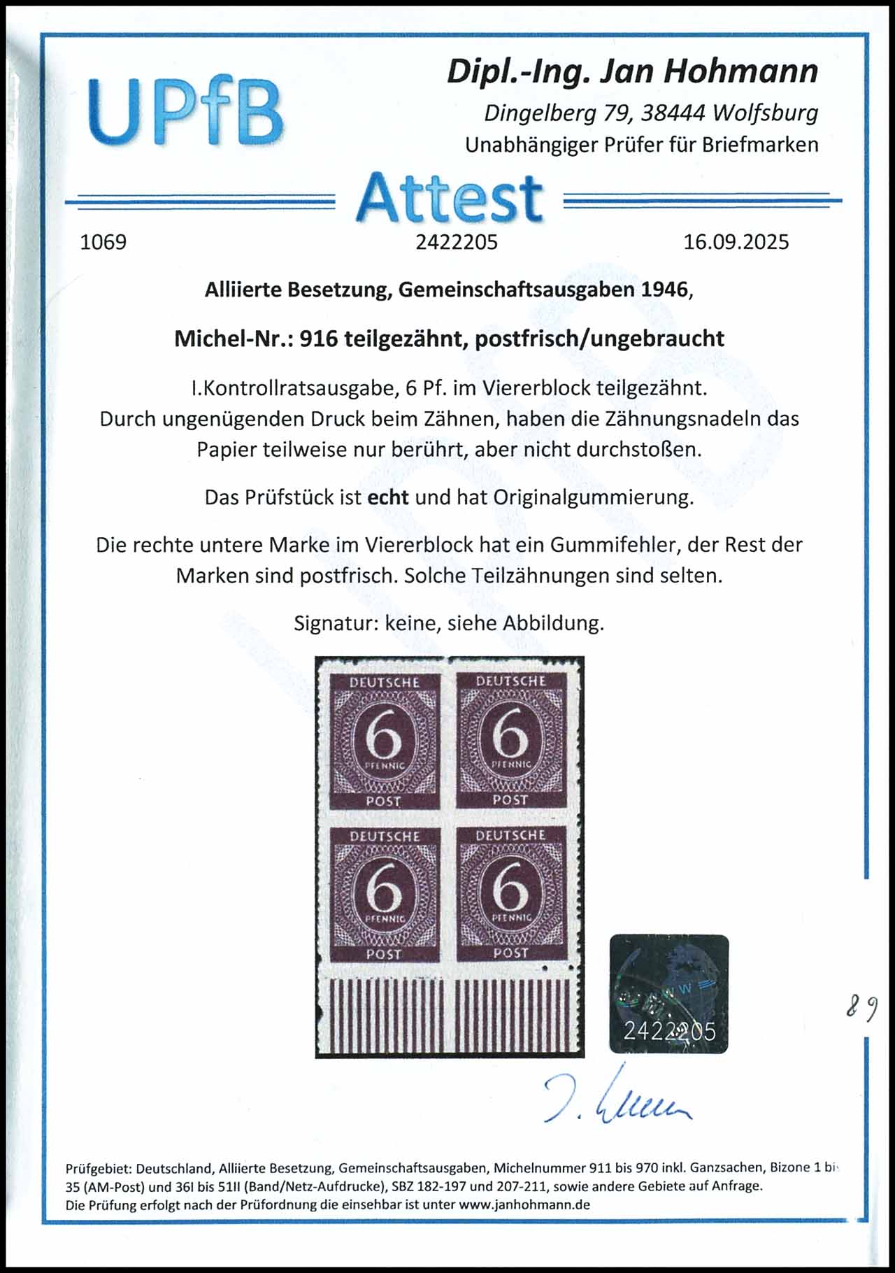6 Pfennig im Viererblock, teilgezähnt, durch ungenügenden Druck beim Zähnungsdurchstich haben die Zähnungsnadeln das Papier teilweise nur berührt, aber nicht durchstoßen, rechte untere Marke mit Gummifehler, der Rest ist postfrisch, Attest Dipl.-Ing. Jan Hohmann UPfB (2025)