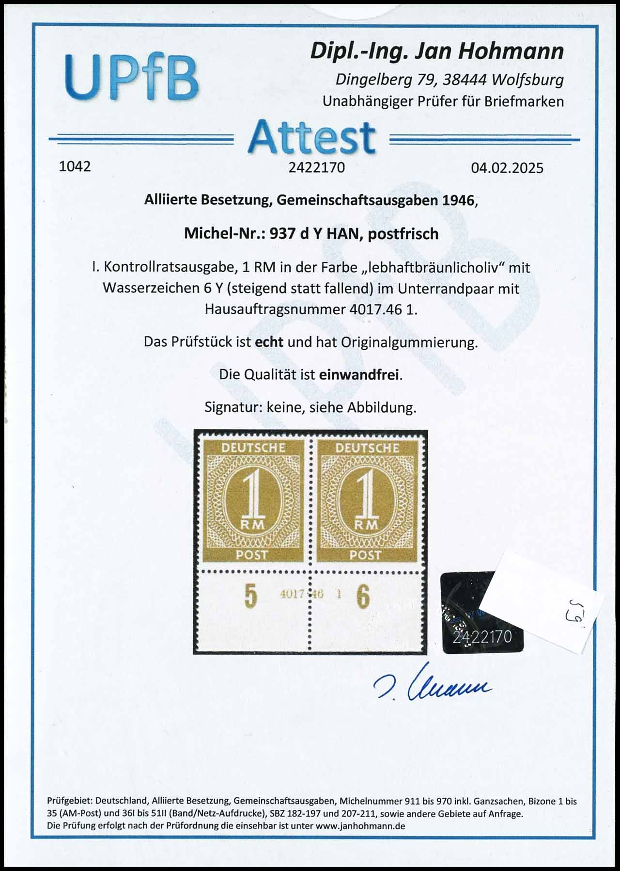 1 Reichsmark, d-Farbe mit Wasserzeichen Y, Unterrandpaar mit HAN 4017.46 1, tadellos, Attest Dipl.-Ing. Jan Hohmann UPfB (2025) "Die Erhaltung ist einwandfrei", Mi. 500.-